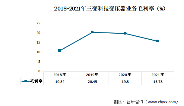 近年来三变科技的变压器业务毛利率出现波动上升趋势,从2018年的10.84%上涨至2019年的20.45%,随后不断下滑至2021年的15.78%。