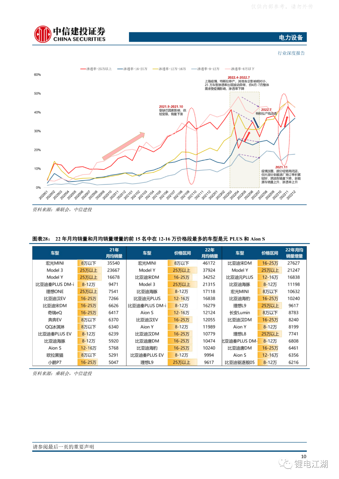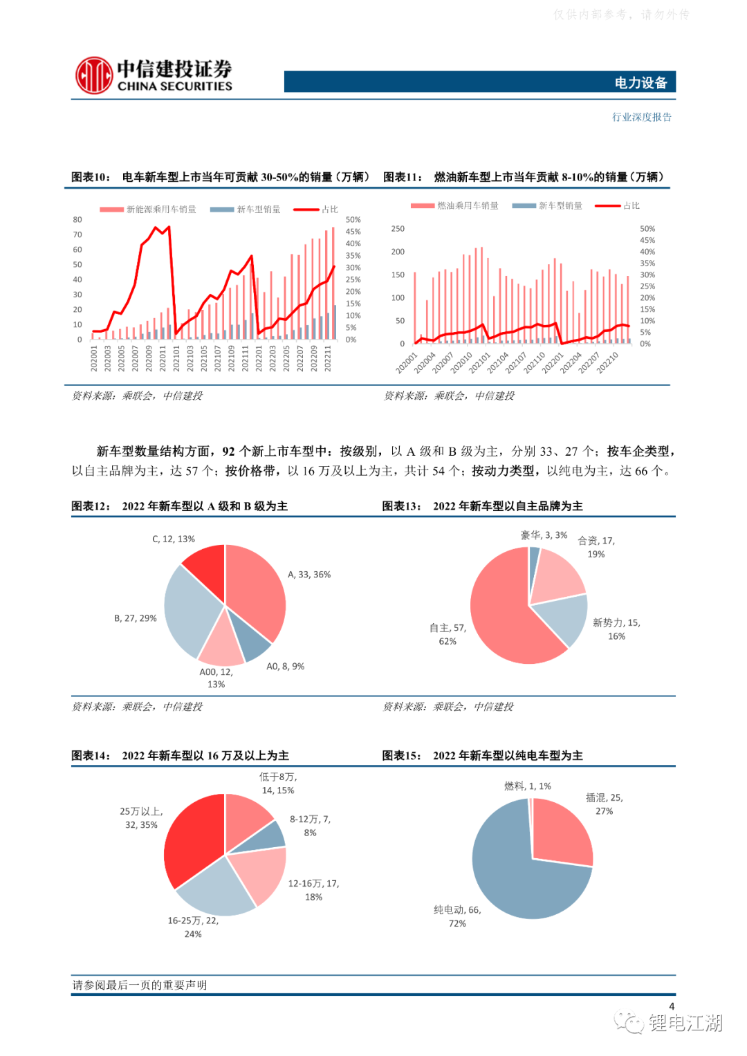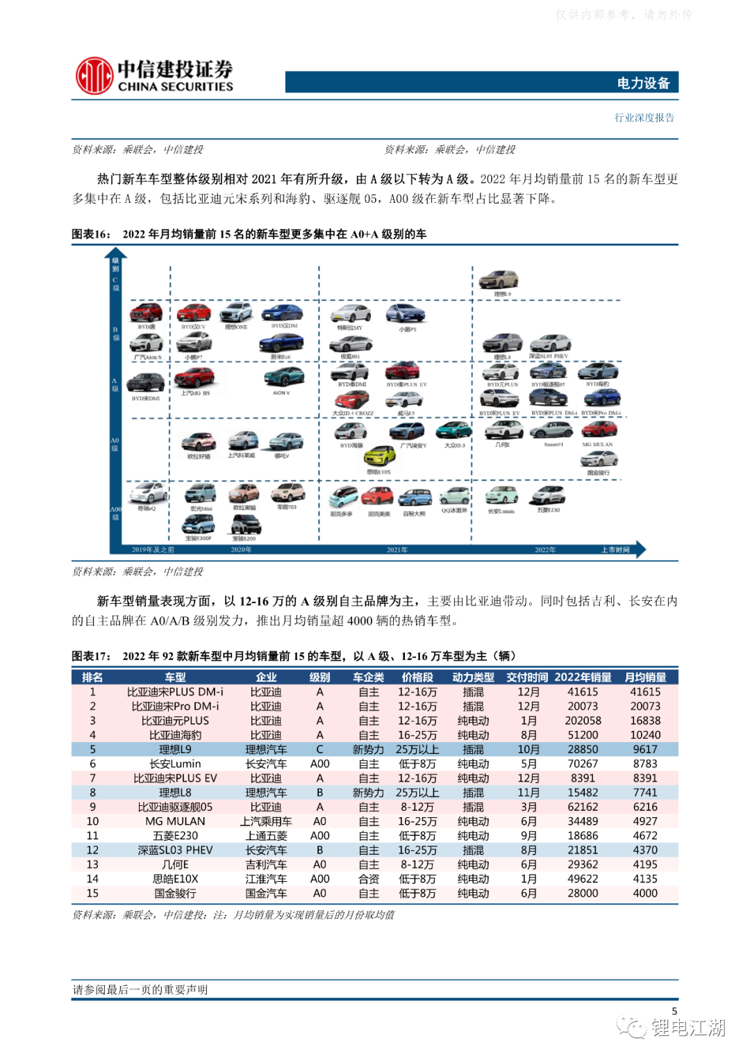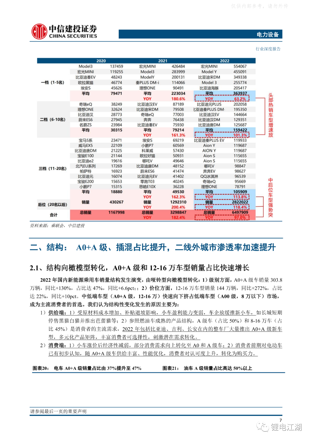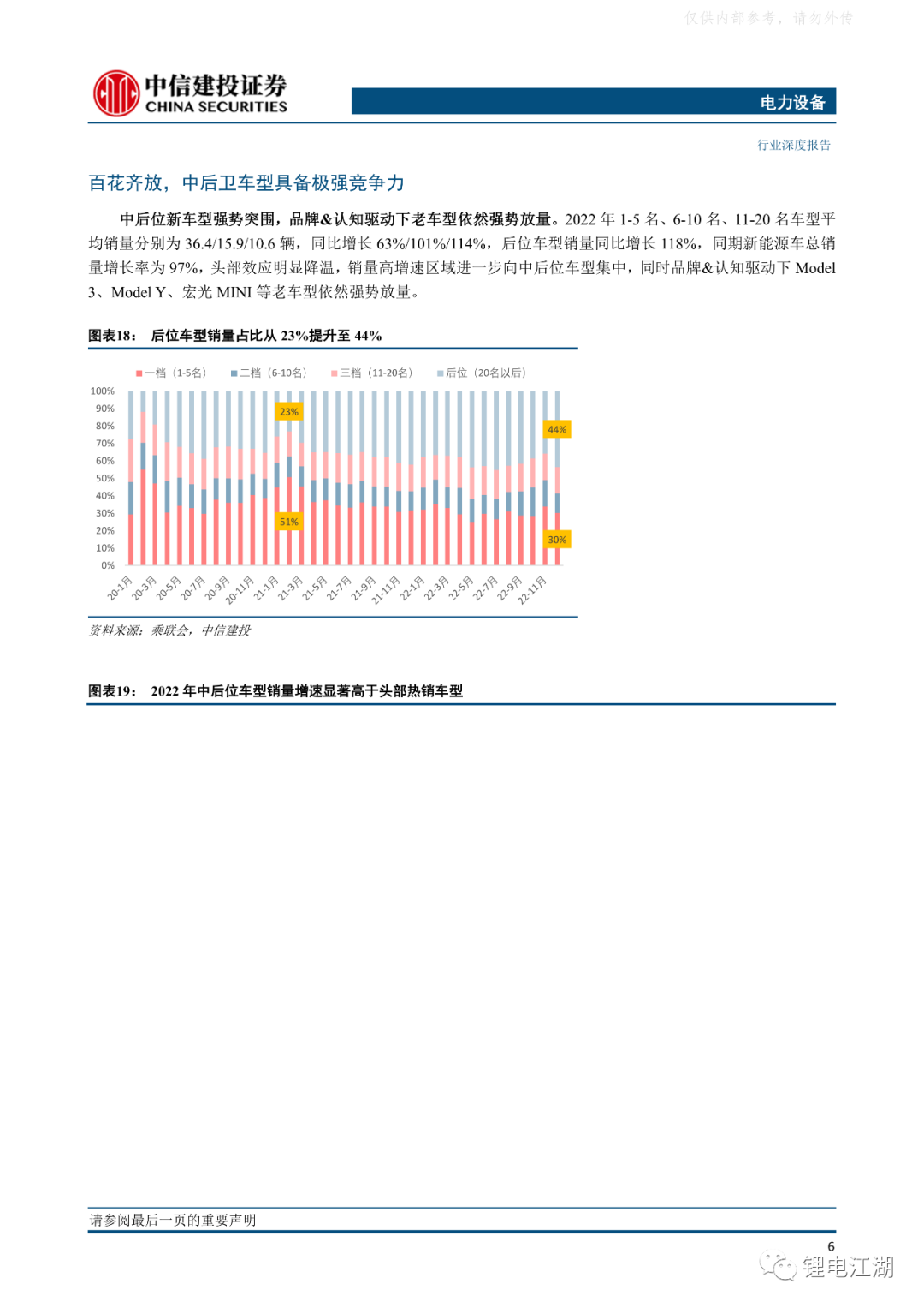 2022年国内共92个全新电动车型上市,对销量贡献占比30%,远高于燃油车的8%。且头部效应明显降温,2022年销量前1-5名、6-10名、11-20名车型销量同比+63%/101%/114%,而20名以后的车型销量同比+118%,销量高增速区域向中后位车型集中。