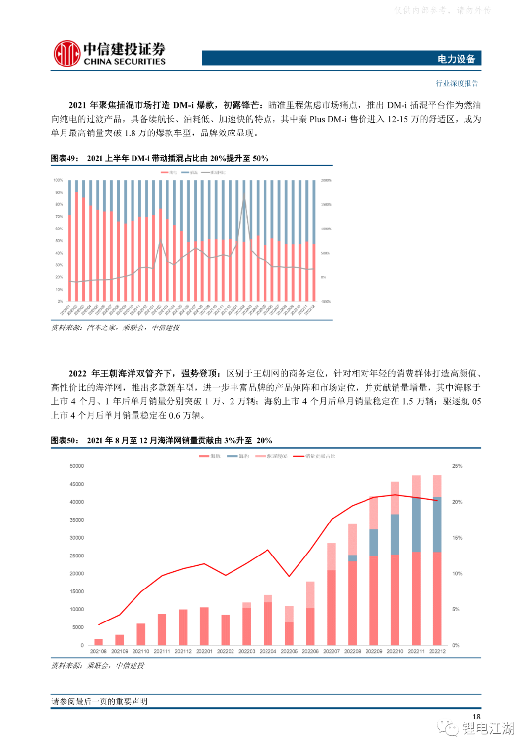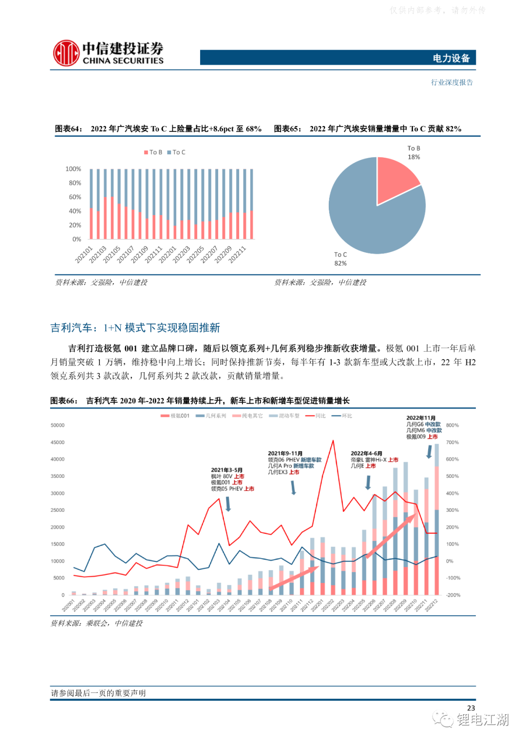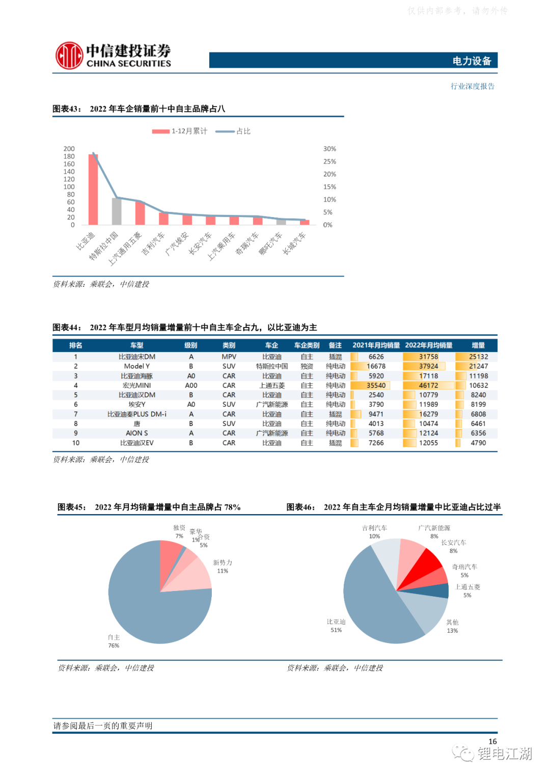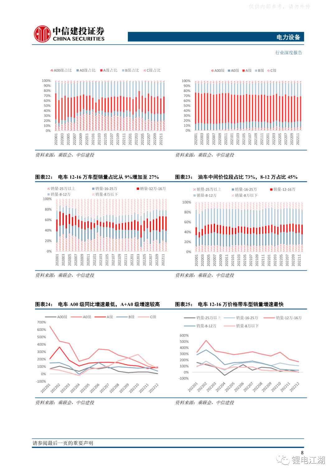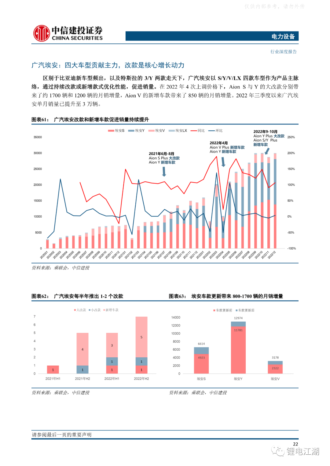 2022年国内共92个全新电动车型上市,对销量贡献占比30%,远高于燃油车的8%。且头部效应明显降温,2022年销量前1-5名、6-10名、11-20名车型销量同比+63%/101%/114%,而20名以后的车型销量同比+118%,销量高增速区域向中后位车型集中。