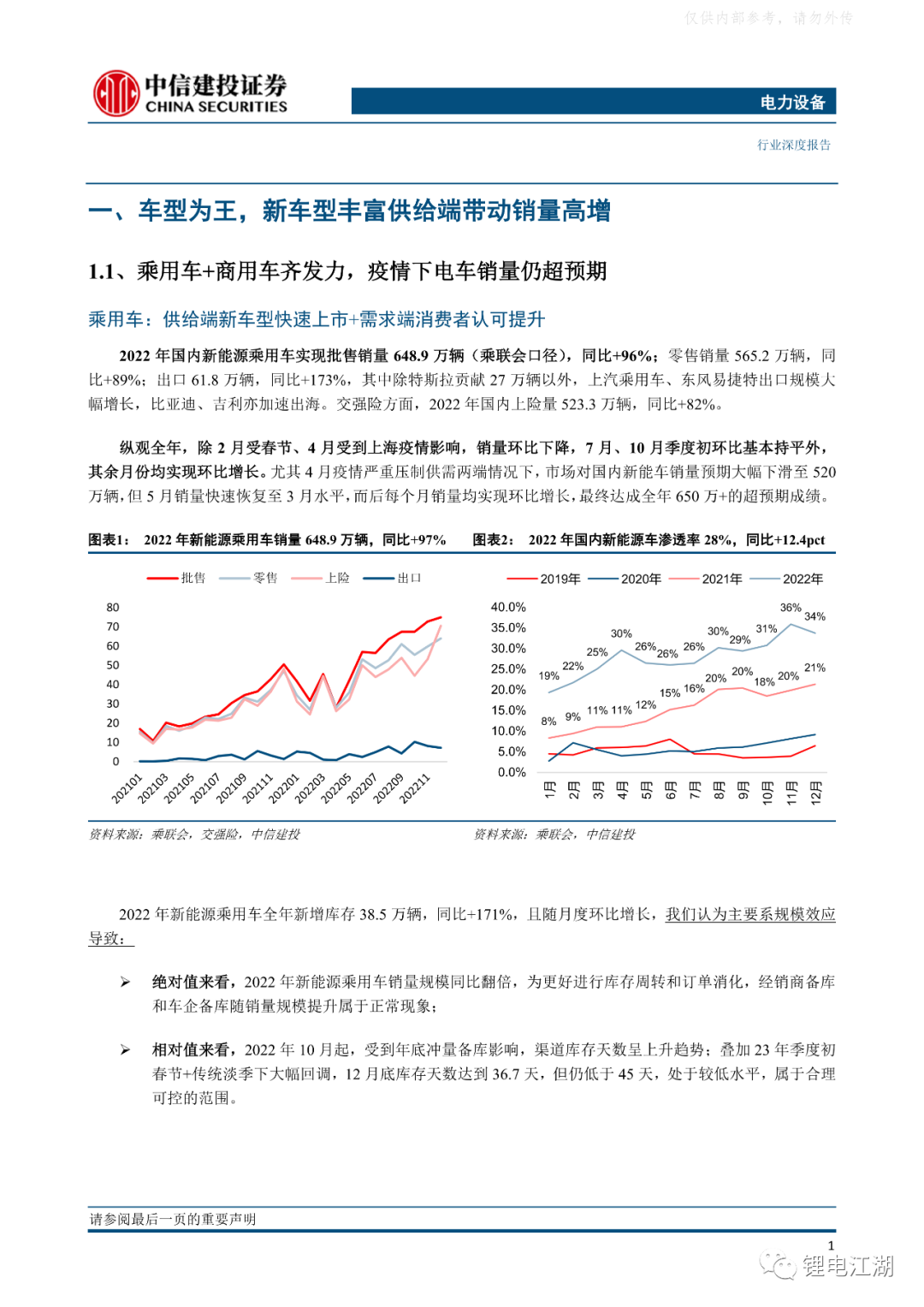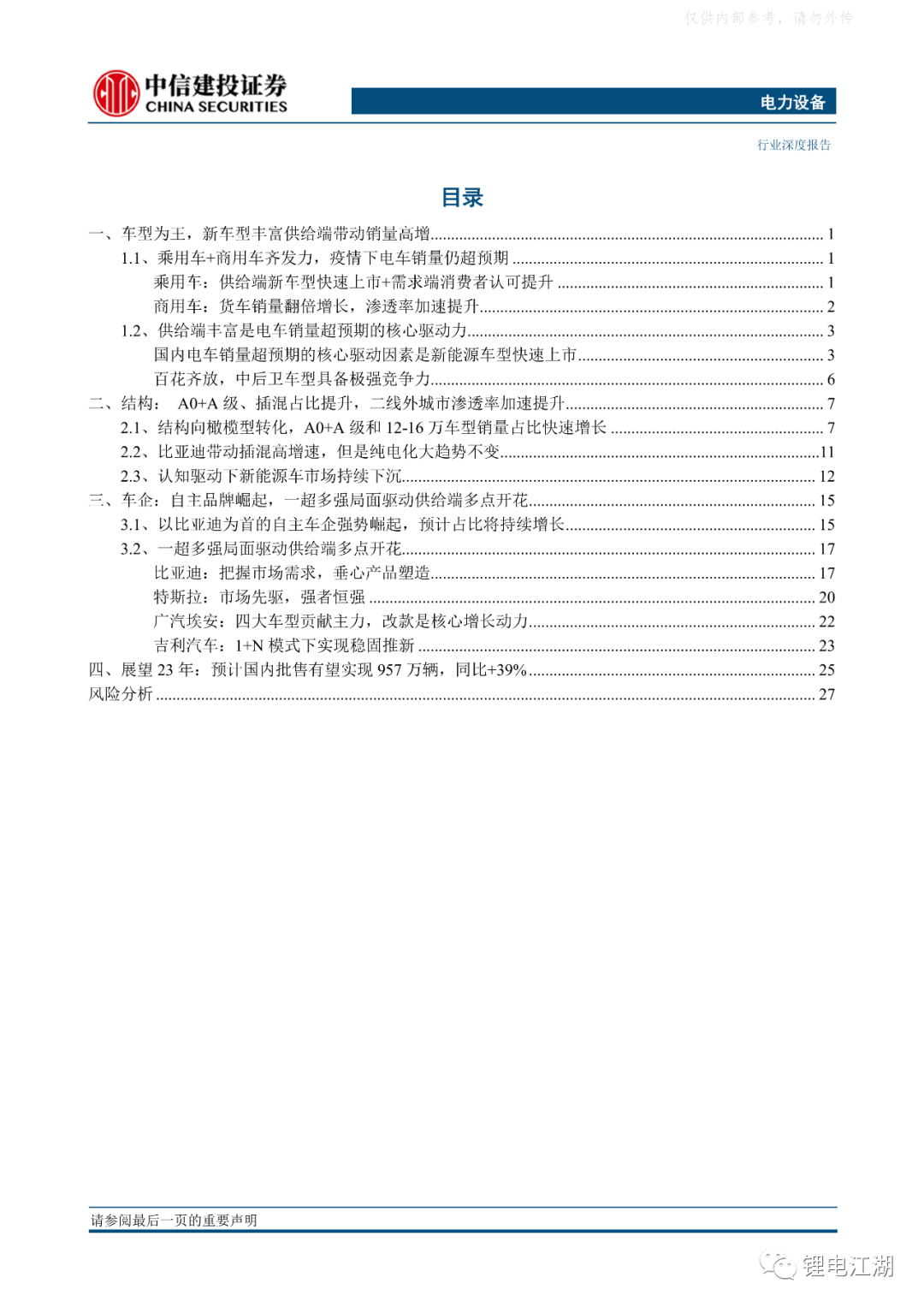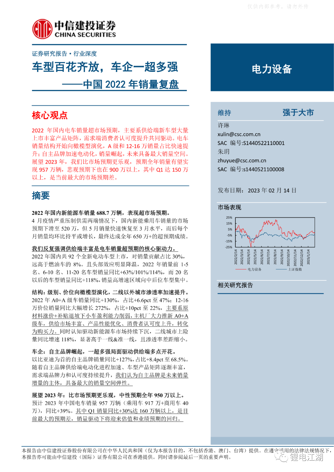 2022年国内电车销量超市场预期,主要系供给端新车型大量上市丰富产品矩阵,需求端消费者认可度提升共同驱动。电车销量结构开始向橄榄型演化,A级和12-16万销量占比快速提升;自主品牌加速电动化,销量崛起,未来具备最大销量空间。展望2023年,我们比市场预期更乐观,预期全年销量有望实现957万辆,悲观预期下也在900万以上,其中Q1达150万以上,是当前最大的市场预期差。
