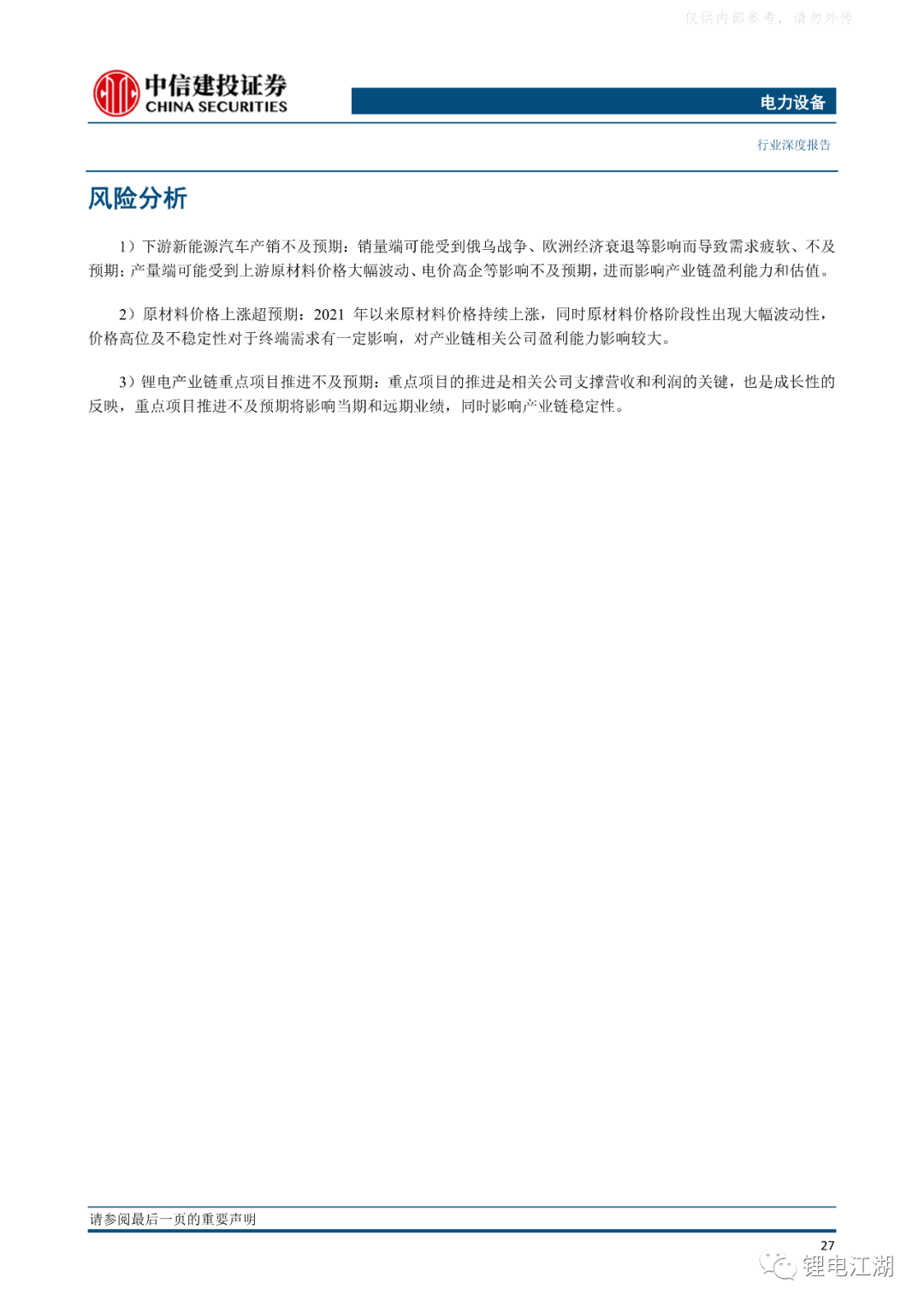 1)下游新能源汽车产销不及预期:销量端可能受到俄乌战争、欧洲经济衰退等影响而导致需求疲软、不及预期;产量端可能受到上游原材料价格大幅波动、电价高企等影响不及预期,进而影响产业链盈利能力和估值。