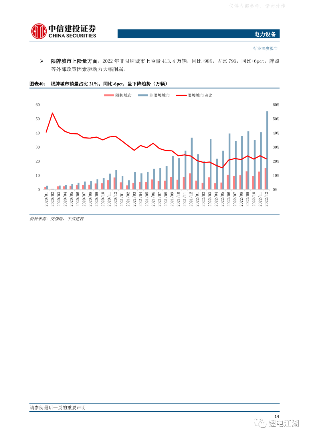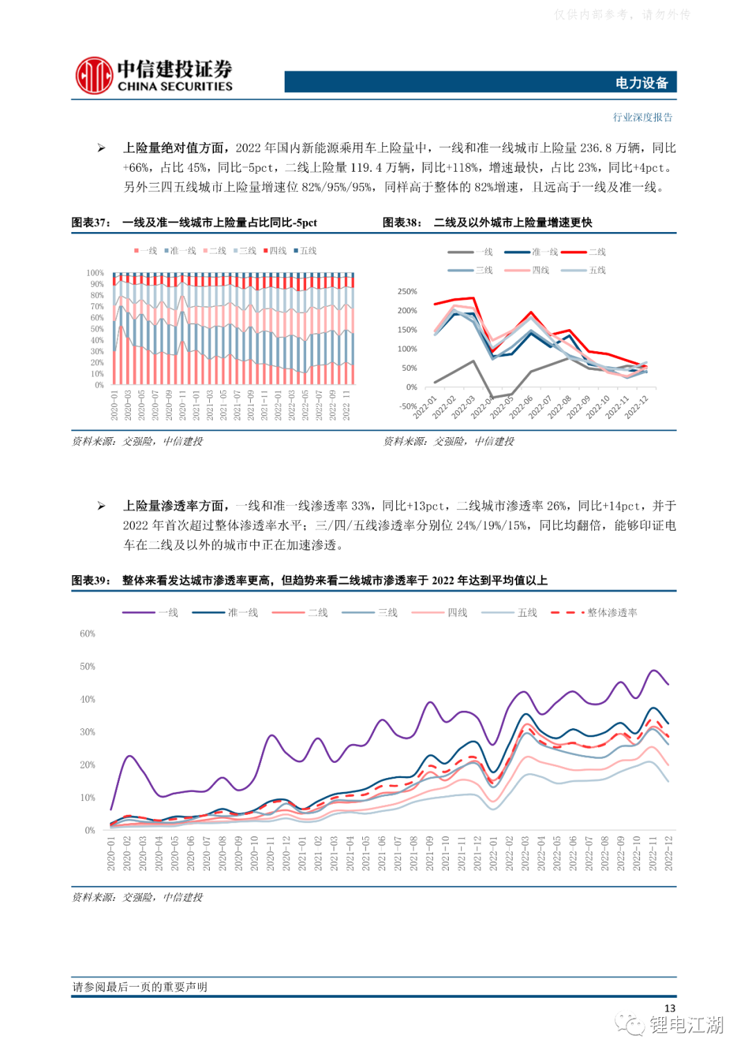 2022年A0+A级车销量同比+130%,占比+6.6pct至47%;12-16万价位销量同比大幅增长272%,占比+10pct至22%,主要系原材料涨价+补贴退坡下小车盈利能力削弱,主机厂大力推新A0+A级车,供给市场丰富、产品性能优化、消费者认可度上升,转化为购买力。同时认知驱动新能源车市场持续下沉,二线城市上险量同比增速118%,显著高于一线&准一线,且渗透率差距缩小。