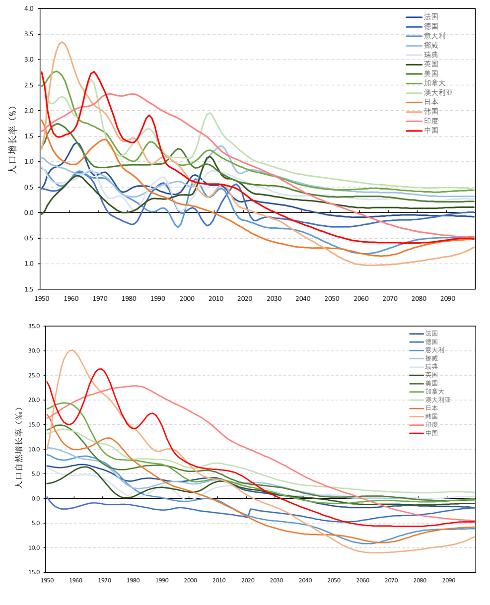 “人口负增长” 很容易从字面上理解,负向增长,也就是人口减少,再严格一点,一般指一定时间、空间范围内总人口规模的绝对减少。最直观的观察方法就是看人口数量增长量和人口增长率。从全球范围内来看,根据联合国《世界人口展望2019》的数据(包含201个国家和地区),直到2100年全球人口仍将保持正向增长的趋势,但是,人口增长动力主要源于撒哈拉以南的非洲地区,而世界其他地区的人口则将在本世纪结束之前达到峰值并出现下降。不过,在美国华盛顿大学健康指标与评估研究所(后文简称:华盛顿大学)的预测方案中,世界人口将在2065年达到峰值97.3亿人,之后则开始下降,即进入负增长时代,到2100年,全球总人口将下降到87.9亿人。区域层面,整体趋势与联合国预测基本一致,除了撒哈拉以南非洲和中亚地区以外地区,在21世纪结束之前均已进入人口负增长时期。来源:Stein Emil Vollset, Emily Goren, etc. Fertility, Mortality, Migration, and Population Scenarios for 195 Countries and Territories from 2017 to 2100: A Forcasting Analysis for the Global Burden of Disease Study. Lancet, online 24th July 2020.发达国家和地区最早步入人口负增长。联合国预测发达国家和地区的人口峰值出现在2036年,高收入国家团队在2049年达到人口峰值,而华盛顿大学预测的高收入国家团队将从2042年开始人口负增长,略早于联合国的预测方案。欠发达地区(不含最不发达地区)的人口负增长到来稍晚一些,按联合国预测方案峰值将出现在2072年。分国家来看,联合国预测到2100年之前会有124个国家和地区进入人口负增长时代,而华盛顿大学给出的预测是167个。数据来源:联合国经济和社会事务部人口司(2019)。世界人口展望2019年。如果选取典型国家,观察其人口变动情况,就会发现部分欧洲国家已经或者即将步入人口负增长:德国人口自然增长率自1950年以来长期保持在零以下(仅靠移民勉强维持人口规模不剧烈下滑);意大利自2016年之后人口增长率持续为负;法国人口峰值大概在2045年前后到来。美国、加拿大、澳大利亚等国家人口增长率在2100年之前仍然保持为正。但结合自然增长率情况不难发现,其人口增长的动力主要来源于人口迁移的机械增长。在本世纪中叶,这些国家的人口自然增长率(不考虑人口迁入)也将由正转负。再来看我们的邻居日本和韩国,以及长期的 “竞争对手” 印度。日本在2010年人口规模已经开始减少,而韩国的人口负增长预计会出现在两年后(但根据最新报道,由于疫情的影响,韩国在2020年已经出现死亡人口超过出生人口的负增长趋势),印度则在2060年前后。虽然人口迁移能在一定程度上推迟人口负增长的发生,比如美国、加拿大等国即是如此,但东亚国家普遍不具备移民文化。数据来源:联合国经济和社会事务部人口司(2019)。世界人口展望2019年。用 “灰犀牛” 来比喻人口负增长再恰当不过,这是因为人口转变是一个长期的过程,现在或者将来观察到的人口变动趋势,其实在久远的过去就已经埋下了种子,人口负增长也是如此。这里需要提到的一个概念就是人口惯性,在一个封闭人口中,如果该人口之前持续增长,即使生育率降到更替水平或更低,在最终达到静止人口之前,该人口规模仍然会保持一段时期的增长趋势,反之亦然。通俗一点来说,就是在不考虑迁移流动的情况下,一个地区的人口如果之前长期增长,即使生育率下降到了很低的水平,但由于在快速增长时期出生的大量人口到生育年龄仍然会带来大量的出生人口,即使相比于上一代规模有所减小,但绝对规模仍然很大,所以总人口仍然将保持一段时期的增长。就像汽车加速过程中,踩下刹车后仍然需要一段时间的减速才能停下,而在减速期间,汽车仍然会发生向前的位移。对人口变动来说,这种增长的惯性会使得未来长期的变动趋势被隐藏在表象之下。在人口统计中,可以用人口惯性因子和人口内在自然增长率对这种被掩盖的趋势进行测量。人口惯性因子大于1或者人口内在自然增长率为正,则意味着未来长期来看人口有持续增长的趋势,反之亦然。欧洲人口在21世纪初已经表现出人口负增长惯性,日本的人口惯性在1990-1995年间出现逆转,新加坡和韩国的转折点出现在2000-2005年。中国的人口惯性自从1970年代生育政策收缩以来逐渐减小,但由于新中国成立初期高生育率和低死亡率带来的人口正增长惯性积累,到90年代人口惯性因子仍然处于1.44的较高水平。随后持续的低生育水平使得人口正增长惯性不断削弱,到2010年保持微弱的正增长惯性。2020年起,中国人口惯性因子将低于1,出现显著且不可逆转的负增长惯性 (茅倬彦 等,2018)。所以说,虽然中国的人口负增长将在未来几年内才会出现,但这一趋势在较早之前已经显现。那么造成人口负增长的根本原因是什么呢?最直接的原因是长期的低生育水平,即一对夫妇生育的子女数长期少于2个。低生育率对人口负增长的影响是不断累积、逐渐显现的长期过程,具有时滞性和隐蔽性。随着低生育水平的持续,人口惯性将由正转负,人口负增长惯性也将持续积累,人口增长速度逐渐减缓,并最终表现为人口减少。已有的经验表明,长期较低的生育水平下,生育水平很难回升,即使回升也很难回升到更替水平以上。一旦人口开始负增长,即便是生育水平回升也难以扭转人口负增长惯性,很难实现人口增长方向由负转正。间接导致人口负增长