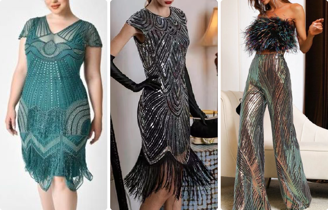So, let’s take our inspiration from Tommy Shelby and gang. Think bespoke three-piece suits, baker boy hats and black leather boots. Make those sequins, pearls and diamonds shine. Still got no clue? We’ve put together some examples for your reference: