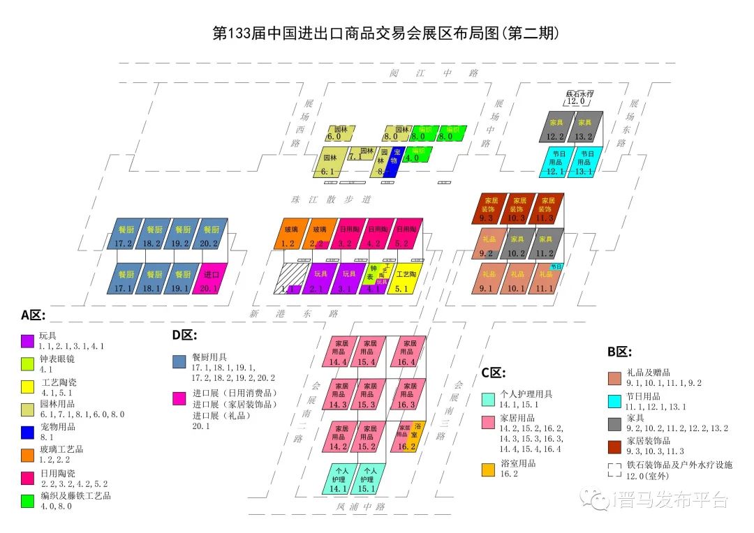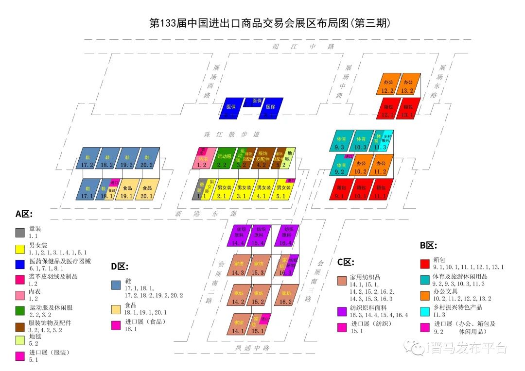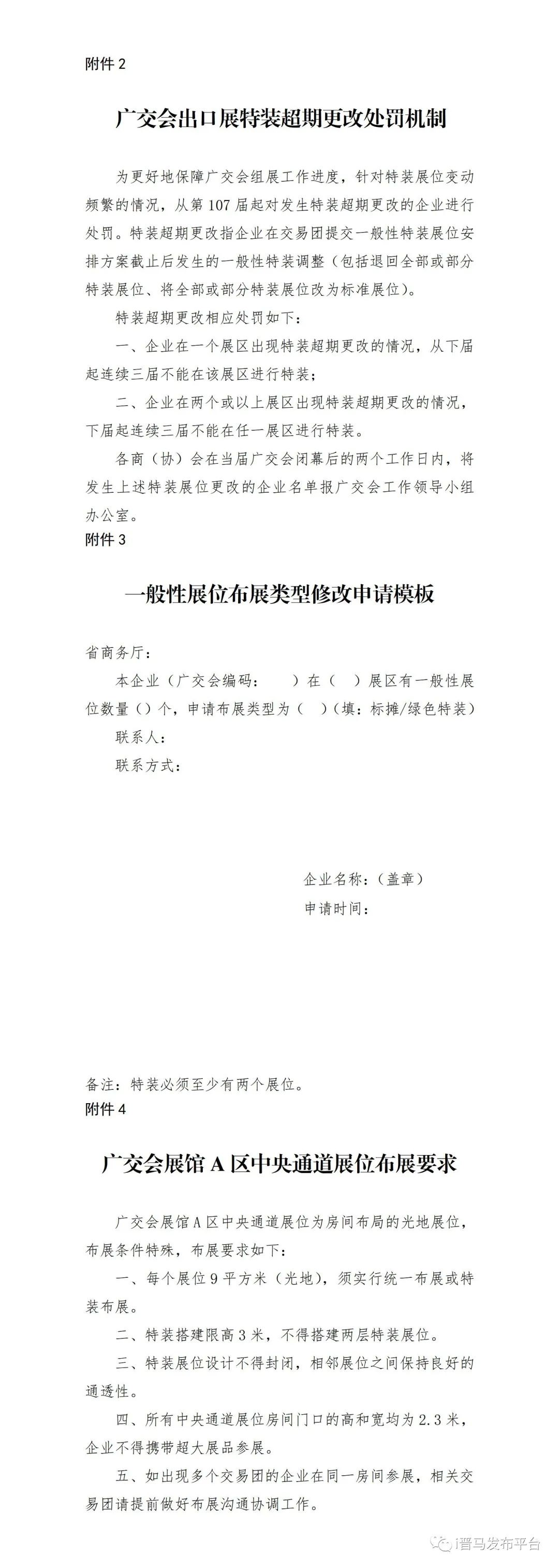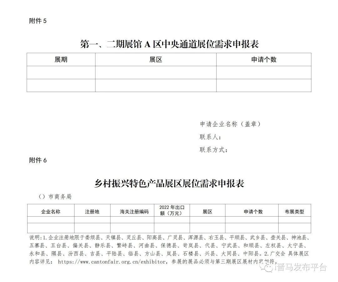 第133届广交会计划恢复三期线下展,线上线下融合举办,首次启用展馆D区,展览规模进一步扩大。前期我厅根据大会工作安排已经组织了线下展展位需求预申报工作,由于当前组展时间十分紧迫,根据大会业务办《关于第133届广交会出口展部分展区展位预安排等事宜的通知》(会业字〔2023〕1号)要求,现将部分展区展位预安排等事项通知如下。第133届广交会计划使用展馆A、B、C、D区,三期展览面积共150万平方米,展位约6.85万个,现有51个展区对应展期不变,各展期按商品大类设置展览题材如下:第一期:电子及家电、照明、车辆及配件、机械、五金工具、建材、化工产品、新能源。第三期:纺织服装、鞋、办公箱包及休闲用品、医药及医疗保健、食品。对品牌企业申报的展位(含品牌展位及粘连一般性展位)需求予以全数安排,仅本届有效,不得退回。需求申报阶段确认不参加线下展的品牌企业,保留其对应展区线上展参展资格。退回及收回的品牌展位本届不重新安排。与品牌展位粘连的一般性展位,不纳入交易团可统筹安排的一般性展位数范围,将由外贸中心统一导入。三、一般性展位数量预安排(不含品牌展位粘连的一般性展位)(一)线下展展位安排方案。我厅根据前期展位预需求申报、出口额和历届广交会参展表现等因素,确定了第133届广交会线下展我省一般性展位预安排方案。展位分配结果可通过“参展易捷通”系统查询,也可通过原申报渠道向所属市商务局或省商务厅查询。请前期未完成相应易捷通操作的参展企业于2月18日前登录广交会“参展易捷通”完成网络系统登记、确认公司及展品信息上传等工作(逾期未提交易捷通展位申请的,将视为放弃分配资格)。(二)布展类型方面。一般性展位数量确定后,原则上大会将不再接受一般性特装展位的追加申请,大会将继续执行特装超期更改处罚机制(详见附件3)。请各参展企业登录“参展易捷通”核对布展类型,如需修改请于2月18日通过“参展易捷通”对布展类型进行操作,或者提交布展类型修改申请(模板详见附件4,盖章后扫描发送至waimaochu208@163.com)。逾期未提交修改申请我厅将按照原展位申请布展类型状态进行确认。(四)注意事项。根据大会规定,安排有线下展展位的企业必须参加线上展。对一般性展位分配结果有异议或需要退出展位申请的,请于2月21日前将正式书面意见反馈省商务厅外贸处,逾期不再受理。对于存在不按规定时限申退展位、不按规定交纳展位费等严重影响我省组团参会工作的企业,以后连续三届广交会将不再安排展位。根据展位需求申报情况,第133届广交会在第一、二期展馆A区设置中央通道展位(简称中央通道展位,下同)各240个。现开展展位需求申报,展位安排仅本届有效,具体要求如下:(一)申报类别范围。为保证展览效果,可申报类别在位于展馆A区的展区范围内设定,具体如下。第一期:电子消费品及信息产品、家用电器、汽车配件。第二期:玩具、钟表眼镜、工艺陶瓷、园林用品、玻璃工艺品、日用陶瓷。(二)布展要求。中央通道展位为房间布局,展示条件特殊,具体布展要求详见附件4。(三)申报方式。有意愿申请中央通道展位的企业请于2月17日中午12点前发送申请表(盖章)报送至waimaochu208@163.com (逾期不再受理申请)(申请表详见附件5)。中央通道展位为房间布局,每个房间最少可容纳4个展位,每一类别申报展位数原则上须为不少于2的偶数。一旦展位安排确定,不得退回。乡村振兴特色产品展区设立于第三期,共有9个展位,面向全省36个脱贫地区的企业进行安排,请各市商务局积极组织符合条件的企业参加,企业展品须符合第三期展品范围。请各市将推荐情况务必于2月17日前报送至waimaochu208@163.com(推荐表详见附件6),并指导企业完成易捷通展位申请操作。六、新能源、宠物用品展区。按现行展位安排办法开展企业评审与安排,具体另文通知。为保障组展秩序,大会继续实行退展位(新能源、宠物用品展位除外)约束机制,即:在完成所有企业展位位置预置截止后的第二天(3月18日)之前(含)退展位的,所退展位不收取展位费;在3月19日至4月14日退展位的,所退展位收取一半展位费;在4月15日及之后退展位的,所退展位收取全额展位费。(一)请各市商务局积极组织符合条件的企业申报第一、二期展馆A区中央通道展位和乡村振兴展区展位,并按要求填报附件5、附件6。(二)第133届广交会展览规模将创历史新高,线上线下组展任务艰巨,组展进度十分紧张。请各市商务局,各参展企业务必严格按照通知要求完成各项工作,确保本届广交会办出水平、办出成效。(三)所有参展事宜,包括缴纳参展费用、办理证件等,均须通过省商务厅(省交易团)办理。广交会出口展不委托除省商务厅(省交易团)以外的任何单位或个人代理任何展位申请、安排等事宜。请企业提高警惕,谨防上当受骗。地址:山西省太原市小店区龙盛街15号山西转型综改示范区科技创新孵化基地1号楼山西省商务厅山西省商务厅