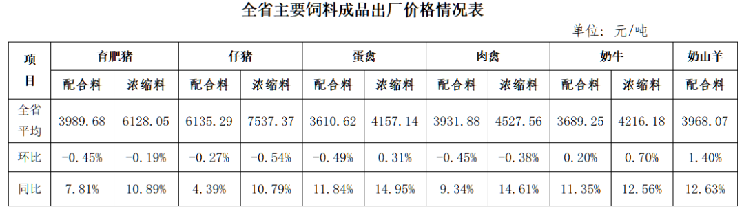 全省饲料企业育肥猪配合料平均出厂价格3989.68元/吨,环比下降0.45%,同比上涨7.81%,浓缩料6128.05元/吨,环比下降0.19%,同比上涨10.89%;仔猪配合料平均出厂价格6135.29元/吨,环比下降0.27%,同比上涨4.39%,浓缩料7537.37元/吨,环比下降0.54%,同比上涨10.79%;蛋禽配合料平均出厂价格3610.62元/吨,环比下降0.49%,同比上涨11.84%,浓缩料4157.14元/吨,环比下降0.31%,同比上涨14.95%;肉禽配合料平均出厂价格3931.88元/吨,环比下降0.45%,同比上涨9.34%,浓缩料4527.56元/吨,环比下降0.38%,同比上涨14.61%;奶牛配合料平均出厂价格3689.25元/吨,环比上涨0.20%,同比上涨11.35%,浓缩料4216.18元/吨,环比上涨0.70%,同比上涨12.56%;奶山羊配合料平均出厂价格3968.07元/吨,环比上涨1.40%,同比上涨12.63%。