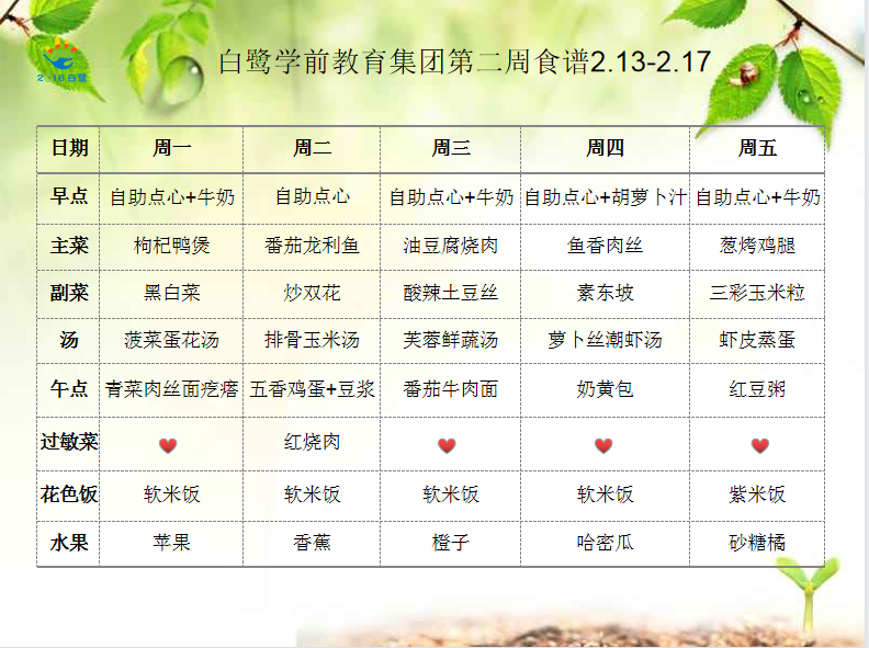 【白鹭·保健】美好“食”光|白鹭学前教育集团第二周食谱2.13-2.17
