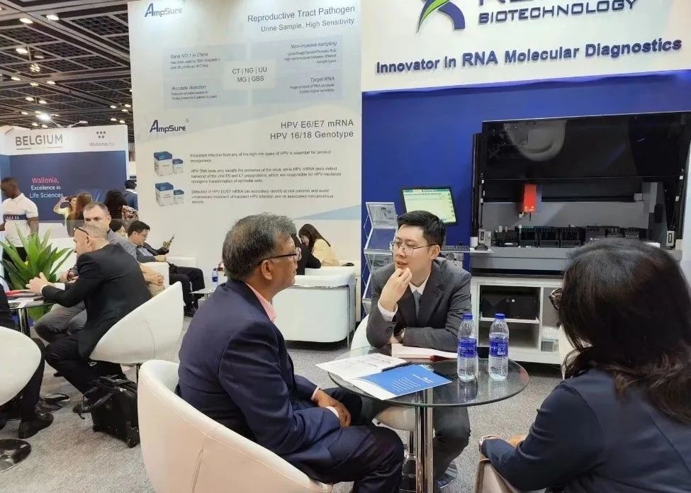 “RNA检测确实非常新颖,能大大提高检测的准确性”,一位来自印度的客户在初次到仁度生殖四项的检测后,对此充满兴趣,多次辗转来到展台咨询并表示合作意愿,想进行下一步合作洽谈;另外一位来自肯尼亚实验室的客户表示她对mRNA的产品很感兴趣,HPV mRNA的产品对宫颈癌的早期筛查有很重要的临床意义。