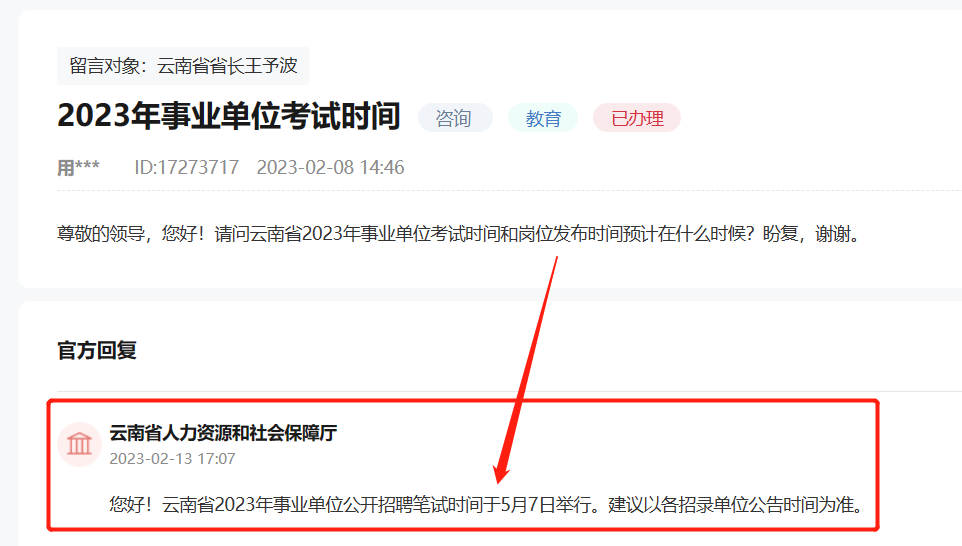 留言提问:尊敬的领导,您好!请问云南省2023年事业单位考试时间和岗位发布时间预计在什么时候?盼复,谢谢。云南省人力资源和社会保障厅回复:您好!云南省2023年事业单位公开招聘笔试时间于5月7日举行。建议以各招录单位公告时间为准。之前青海和宁夏的通知都是延期到5月笔试,看来云南依旧参加联考而事业单位联考笔试时间为5月7日。而湖北官宣4月初笔试