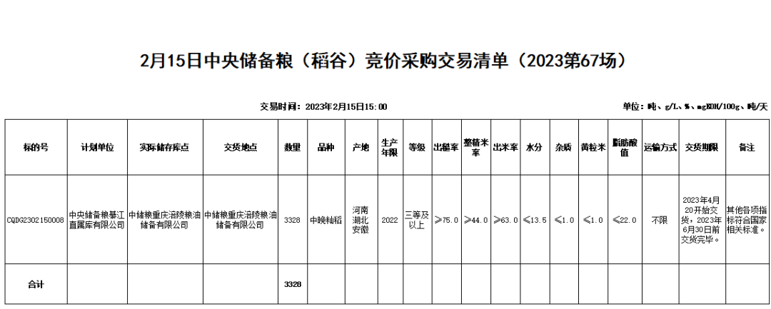 受中国储备粮管理集团有限公司成都分公司委托,重庆市粮油批发市场有限责任公司(即国家粮食重庆交易中心,以下简称“批发市场”)定于2023年2月15日15:00举办中央储备粮(稻谷)竞价采购交易会,现将有关事项公告如下:2. 产地、年限及数量:河南、湖北、安徽2022年产中晚籼稻3328吨。5. 质量要求:一是符合稻谷国标(GB1350-2009)三等及以上质量标准,其中:出糙率≥75.0%;整精米率≥44.0%;出米率≥63.0%;水分≤13.5%(水分在13.6%-14.5%之间的,每超0.1%扣量0.12%,水分超过14.5%买方有权拒收);杂质≤1.0%(杂质超标需整理达标后入库,筛下物由卖方承担自行处理,杂质超2.0%买方有权拒收);黄粒米≤1.0%。二是符合稻谷储存品质判定规则(GB/T20569-2006)宜存标准,其中脂肪酸值≤22mgKOH/100g。三是符合食品安全标准食品中真菌毒素限量(GB2761-2017)指标。四是符合国家卫生标准食品中污染物限量(GB2762-2017)指标。五是其他各项指标必须符合国家相关标准。六是严禁掺杂陈粮及各级储备轮出粮源,严禁跨省粮源掺混发运。如有发现故意掺杂使假、转圈粮行为,买方拒收并收取违约保证金,并移交当地粮食和市场执法部门处理。6. 数量、质量验收:数量以到中储粮重庆涪陵粮油储备有限公司地磅数量为准。质量以到库综合扦样检验为准。粮食到达交货地点后,买方(或买方指定的存储库点企业)进行检验,对检验合格的粮食方能入库,对检验不合格的粮食可拒收。买卖双方如有质量争议,可申请有资质的第三方检测机构进行复检,由此产生的费用由过错方承担。7. 本次交易清单附后。具体交易品种和数量等信息如有变化,以即时公告及交易清单为准。1. 报名资格:国内具有粮油生产、经营资格的企业且在国家粮食电子交易平台注册的有效会员。2. 报名时间:2023年2月15日13:00前。报名参与交易即视作全面承认并遵守《中央储备粮竞价采购交易规则(试行)》和交易公告、交易清单等要求。1. 本次竞价交易使用国家粮食交易平台地储交易系统,2023年2月15日15:00通过网络对委托标的依次按交易节进行交易。请报名参加竞价交易的会员按时登录国家粮食交易中心官网(www.grainmarket.com.cn)→点击网页上方“请登录”或右方“用户中心”进行会员登录→点击“交易”板块→选择“重庆市场”→2月15日中央储备粮(稻谷)竞价采购交易专场。1. 保证金的收取和释放:参与竞价交易的会员须交纳保证金160元/吨(其中:履约保证金150元/吨和交易保证金10元/吨),于2023年2月15日13:00前到达批发市场指定银行账户,确保有足额的保证金进行交易。单笔合同交割完毕后,保证金释放。如合同部分交割,该合同数量的所有保证金处于冻结状态。2. 保证金转入:汇款时请备注“保证金”,待资金到账后,进入系统“用户中心”的资金界面,点击用户名称下方的“交易账户:明细”,将足额保证金“转入”重庆市场。3. 交易手续费:按成交金额的0.8‰向卖方收取。1. 成交价格:散粮到中储粮重庆涪陵粮油储备有限公司仓前交货价。2. 合同签订:自成交之日起3个工作日内买卖双方在交易系统内签订电子购销合同或以邮寄、扫描等方式签订,如逾期未签订购销合同,则对违约方作违约处理。3. 入库及付款:2023年4月20日开始交货,2023年6月30日前交货完毕。买方须于成交之日起按进度将货款一次或分批汇入批发市场指定账户。当货物到达交货地点后,由中央储备粮綦江直属库有限公司检验人员检斤验质。4. 结算:初检合格入库后,双方按入库进度可分批签订《验收确认单》,批发市场按《验收确认单》数量在3个工作日内支付卖方90%货款。合同执行完毕收到卖方开具发票后,买卖双方签定《验收确认单》,由卖方送达批发市场,批发市场在3个工作日内按《验收确认单》将剩余货款拨付给卖方。2. 开户银行:中国农业银行股份有限公司重庆九龙坡中梁山支行 3. 账 号:31-0707010400088881. 本场交易细则详见“重庆粮网”(www.grainmarket.com.cn/centerweb/region/CQ)、“重庆粮食集团”官网(www.cqgrain.com)《中央储备粮竞价采购交易规则(试行)》,与此规则不一致的以本次公告为准。2. 会员成交后到委托方指定交货地点交货时,需遵守当地的疫情防控政策,做好疫情防控工作。3. 各会员单位发现以陈顶新、转圈粮、套取财政补贴、人为设置障碍造成入库难等违法违规问题的,请拨打12325举报。4. 市场交易部联系电话:023-65269777 023-65269283▶ 网站 | www.grainmarket.com.cn/centerweb/region/CQ