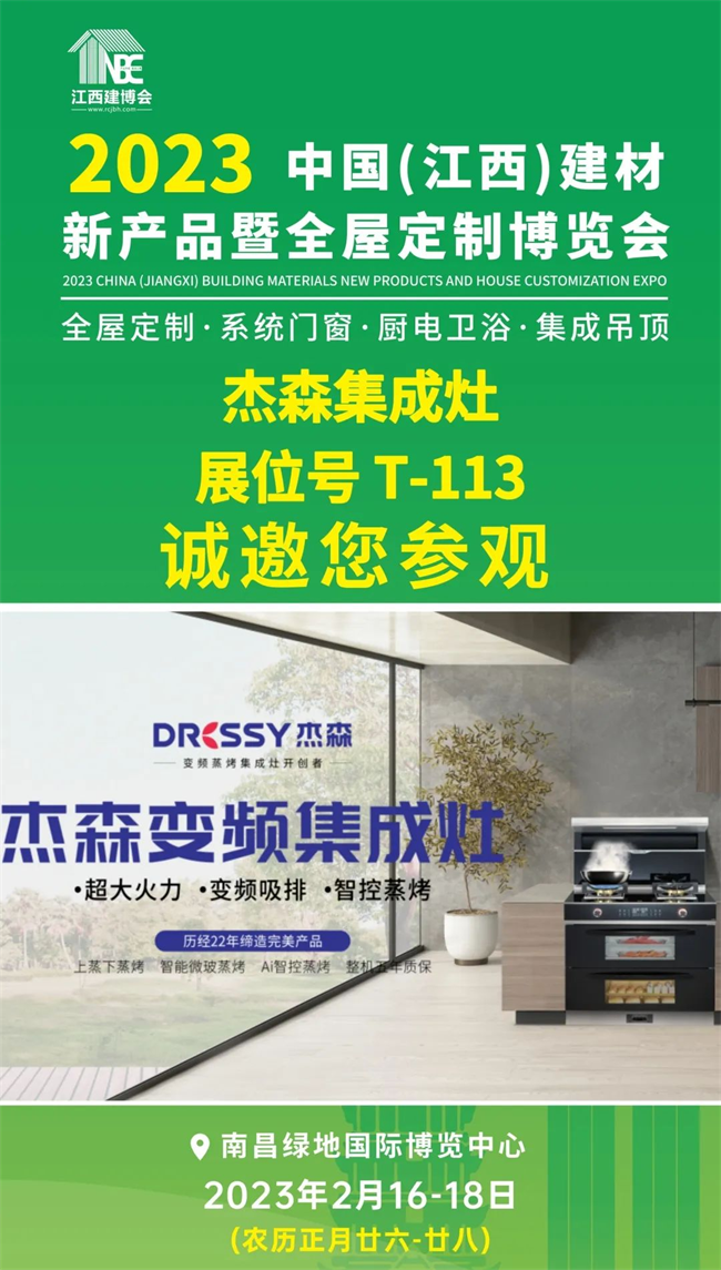 先进的理念指导离不开前沿的与会交流,杰森变频集成灶频频亮相各大行业知名展会,借鉴亮点,交流经验。此次江西建博会也不例外,杰森变频集成灶应邀出席,入驻南昌绿地国际博览中心T-113展位。