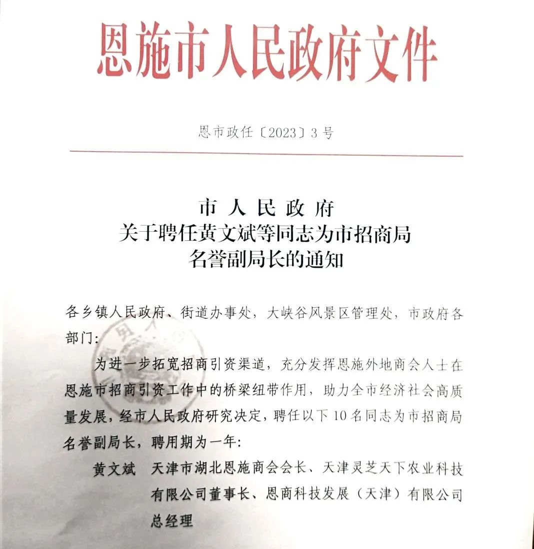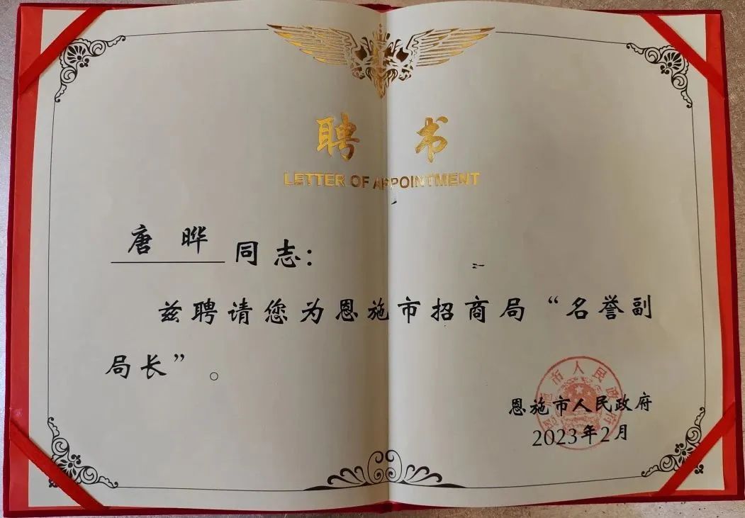 商会唐晔会长被恩施市人民政府聘任为恩施市招商局“名誉副局长”,这是恩施市对商会招商引资工作成效的认可和肯定。