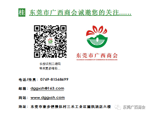 本微信公众号为东莞市广西商会所有,如公众号的文章标题、内容、图片及视频涉及版权或其它问题,请及时与本会联系,我们将在第一时间修改或删除,东莞市广西商会拥有对此声明的最终解释权。