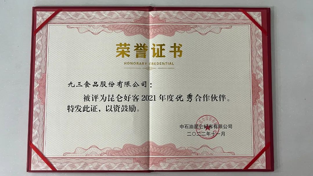 持续深耕中石油、中石化系统,现已成为九三开拓全国化市场的关键“利器”。九三食品公司凭借优异的市场表现,荣获“昆仑好客2021年度优秀合作伙伴”奖,提振双方合作信心,为未来合作共赢之路奠定了良好的基础。