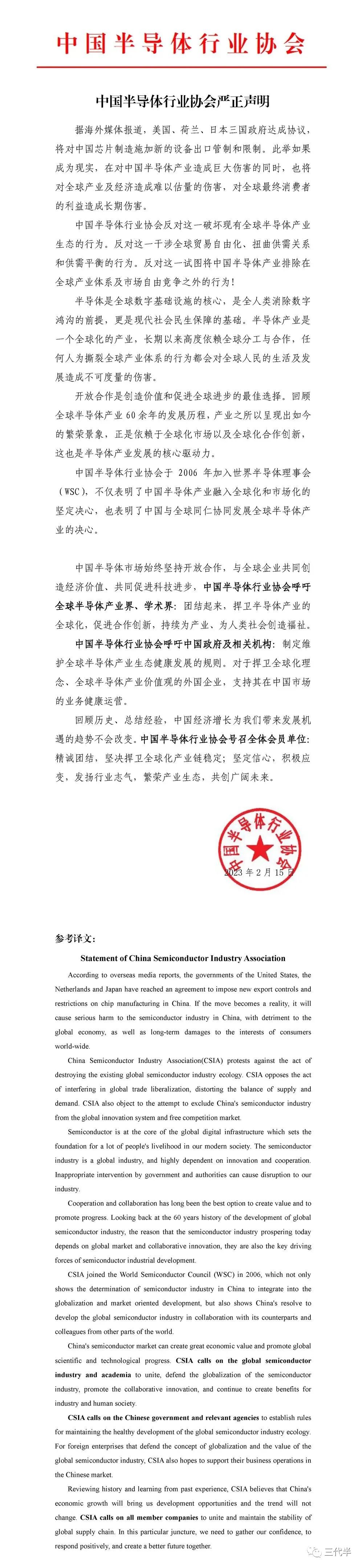 声明还称,中国半导体行业协会反对这一破坏现有全球半导体产业生态的行为。反对这一干涉全球贸易自由化、扭曲供需关系和供需平衡的行为。反对这一试图将中国半导体产业排除在全球产业体系及市场自由竞争之外的行为!
