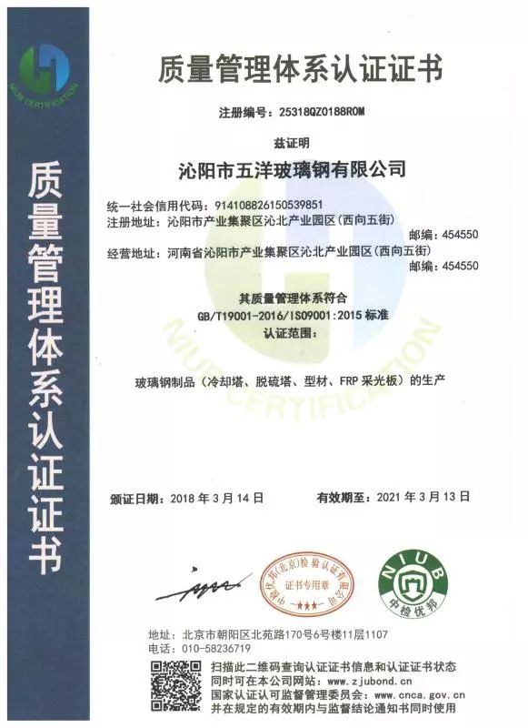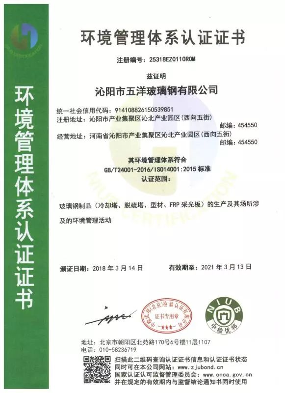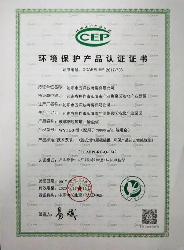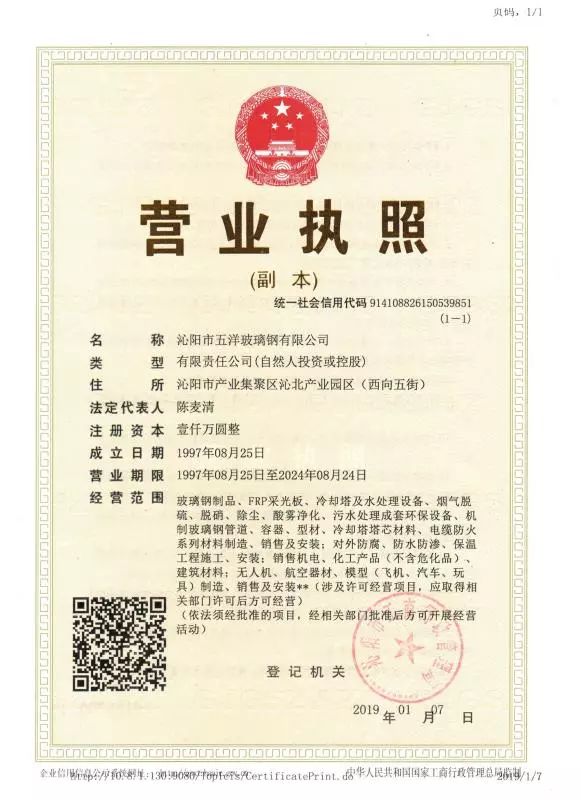 沁阳市五洋玻璃钢厂创建于1988年,是从事生产玻璃钢冷却塔系列、FRP采光板系列、拉挤缠绕系列、通风管道系列、电缆防火、电缆槽盒、防腐施工,玻璃钢脱硫塔、超低排放除尘设备及湿式静电除尘器等系列产品的专业化生产厂家。产品销售全国各地,深受用户好评。2015年通过改制,正式更名为沁阳市五洋玻璃钢有限公司。