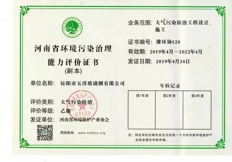 我们以“环保”、“安全”为环境和健康方针,将玻璃钢酸雾脱硫净化塔重新设计与改造,于2012年获得国家知识产权局颁发的“实用新型专利”,同年获得河南省环境污染治理资格证书,并通过河南省环境监测站的检测,从此奠定我们在环保科技上又上一个新台阶。
