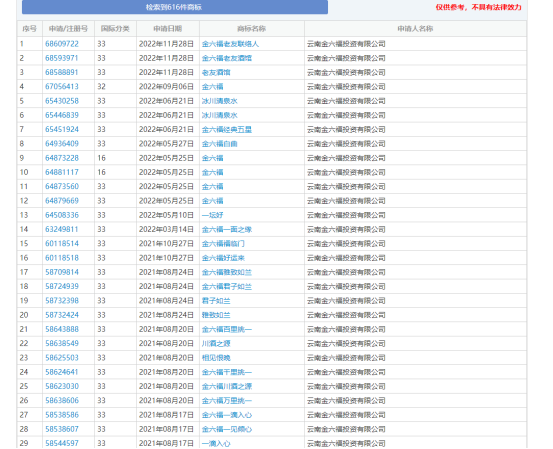 昔日靠贴牌发家的金六福,如今摇身一变成行业巨头,金六福的成功值得很多酒企学习,金六福有清醒的认知,在春风得意之时,并没有停滞不前,反而沉下心钻研酒质,最终迎来逆袭。成为现在市值百亿的大公司。而且名下申请的商标有616件。光白酒商标就申请了587件,真是把品牌的王牌产品保护的明明白白。防止别人剐蹭自己的流量。