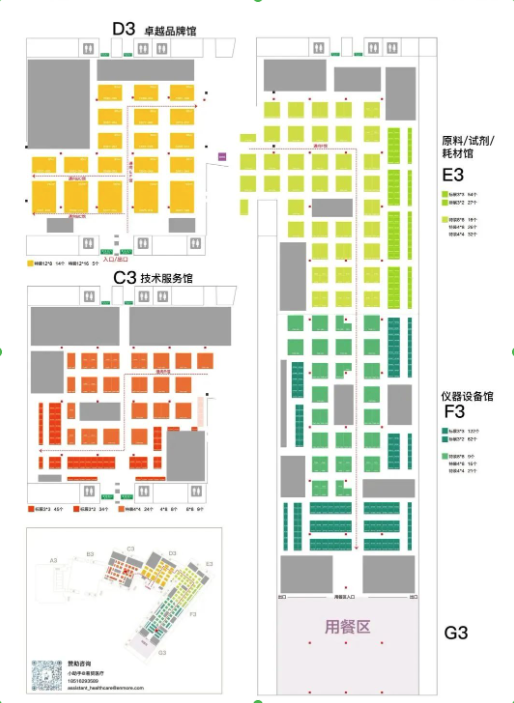 C3-技术服务、D3-卓越品牌、E3-原料 | 试剂 | 耗材、F3\G3-仪器设备五大展馆