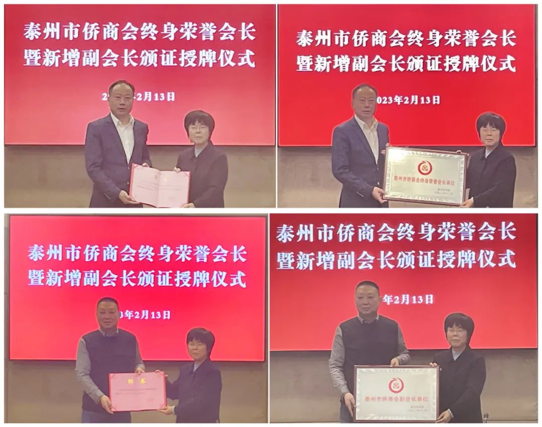 2月13日下午,泰州市侨联在泰州市政府A楼会议室为陈俊、章贵祥2人举行了泰州市侨商会终身荣誉会长暨新增副会长颁证授牌仪式。泰州市侨联共同发展处处长、四级调研员夏永宏主持颁证授牌仪式,市侨联领导班子成员和相关业务处室人员参加了颁证授牌仪式。市侨商会副秘书长范梅梅首先宣读了市侨商会授予陈俊先生泰州市侨商会终身荣誉会长、新增章贵祥先生泰州市侨商会副会长的决定。接着,陈俊、章贵祥2人分别作了表态发言,陈俊和章贵祥均表示,非常感谢泰州市侨联、泰州市侨商会的认可和肯定,今后一定会珍惜荣誉,履职担当,争取作出新的更大的贡献。陈俊表示,作为一名海外赤子,一名从泰州走出去的侨商对获得终身荣誉会长深感荣幸,同时也倍感使命在肩,责任重大。如果说以前曾经为发挥侨领作用、促进泰州与澳洲友好往来和履行公益担当、承当社会责任作出过一些贡献,今后将以此颁证授牌为契机,立足新起点,始终不忘初心,奋楫扬帆再出发,矢志不渝地继续发挥好海外侨社团和侨领的独特作用,为推动和促进泰州与澳洲开展经贸合作和人文友好交流作出更大的贡献。章贵祥表示,非常感谢泰州市侨联领导和泰州市侨商会领导的关心和厚爱,加入侨商会倍感荣幸,作为一名长期在外发展的港商和侨商,今后一定会万分珍惜机会和荣誉,责无旁贷地为家乡多作贡献,下一步将在泰州设立分公司,将公司的有关业务转向泰州并将公司后勤保障基地设在泰州,为促进泰州人才培养、就业培训和高质量发展贡献一份力量。