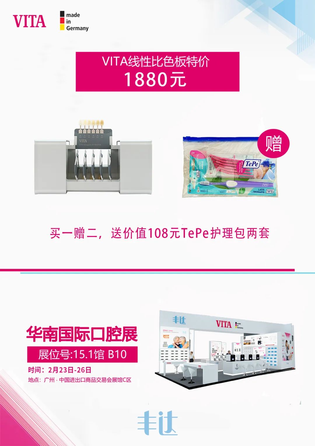 展会期间VITA线性比色板特价促销1880元,买一即赠价值108元瑞典TePe护理包两套(赠完即止) |