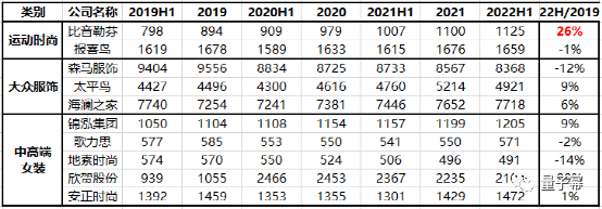 A股主要上市品牌服装各家期末门店数量: