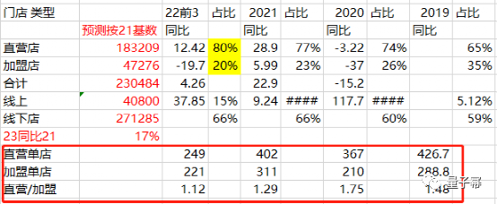 21/22年销售收入直营/加盟比例一直在下降,有新店销售需要爬坡的原因,也有留下的加盟店属于加盟店中强者。