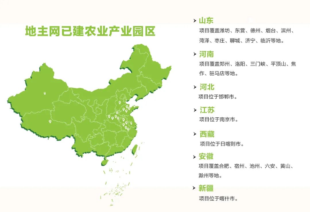 地主网络目前已搭建27个数字农业产业园,服务农产品基地28.8万亩,为其提供标准化、数字化、订单化全产业链服务,累计配置数字农业智能系统达16000余亩,目前运行良好。