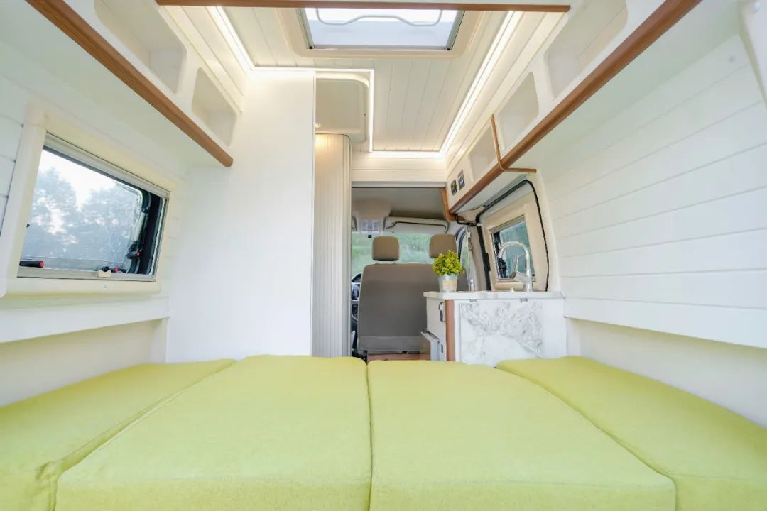 整车尺寸为5120×2018×2665mm,可以蓝牌C照上路。车厢采用了加高硬顶设计和全车发泡工艺,保证了更好的使用体验。尾部别致的凸起造型为玻璃钢储物背包,结合整车的调性,看起来有点可爱。