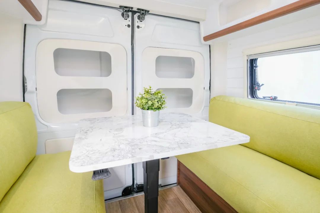 内饰延续了清新风格,官方还没有命名,不妨先叫其“绿野仙棕”吧。实拍车型为三座布局,最大亮点是后部的卡座区,可以根据需要自由切换。