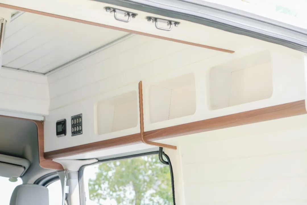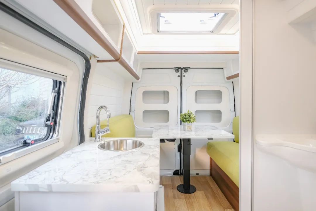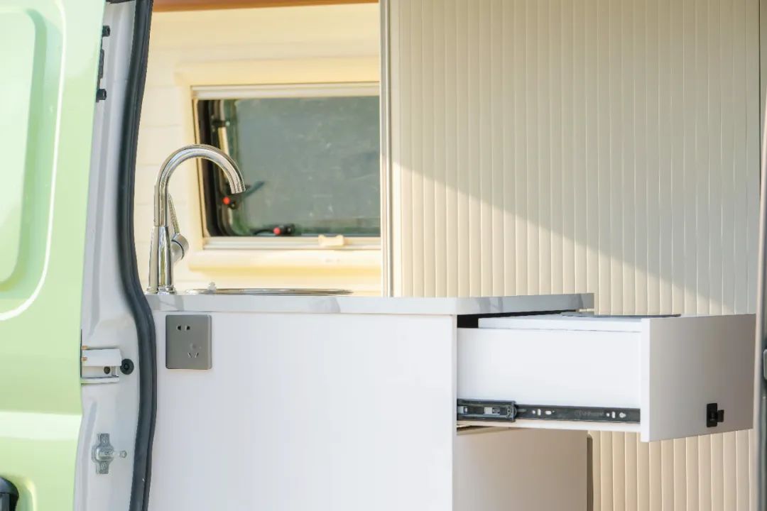 不得不说这款小车跟阳光真的很配,厨房区和储物吊柜在光照充足时看起来颜值颇高。厨房区采用了多处抽拉设计,900W电磁炉和储物板平常都可以收起,不占用空间。此外一体式橱柜还内嵌有50L冰箱。