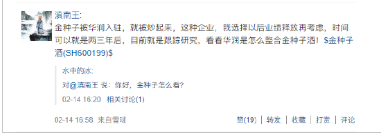 近日,在一场“白酒板块值得期待吗”主题访谈中,有投资者提问称,对金种子酒怎么看。白酒研究达人滇南王表示,金种子被华润入驻后便被炒起来,业绩释放以后自己再考虑,目前就是跟踪研究,看看华润是怎么整合金种子酒。