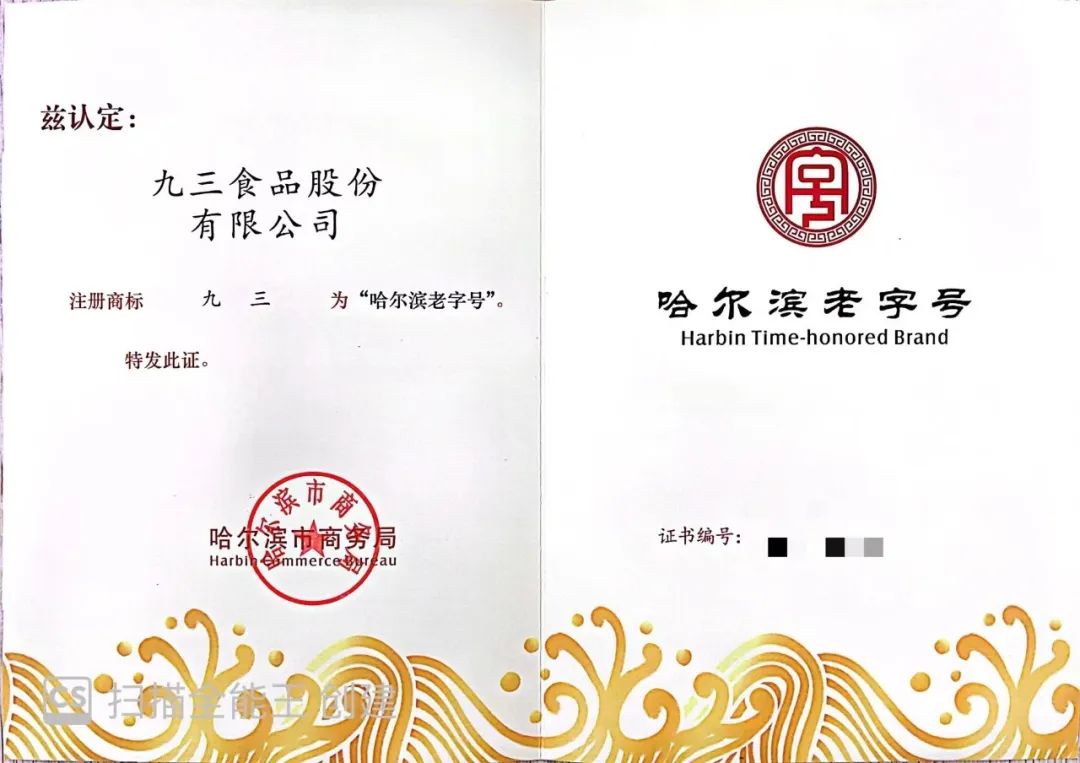 近日,哈尔滨市老字号企业协会成立大会在哈尔滨友谊宫召开,九三食品股份有限公司喜获“哈尔滨老字号”荣誉称号。黑龙江省商务厅、哈尔滨市商务局、市工商联、市民政局等相关领导以及九三食品公司等来自中华老字号、龙江老字号、哈尔滨老字号的130家企业出席本次大会。