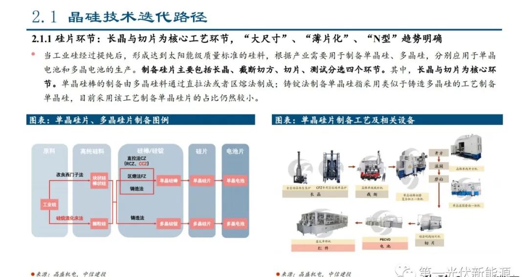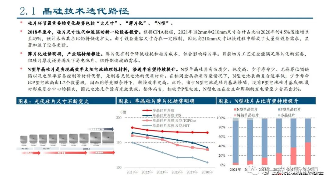 2.1.1、硅片环节:长晶与切片为核心工艺环节,“大尺寸”、“薄片化”、“N型”趋势明确