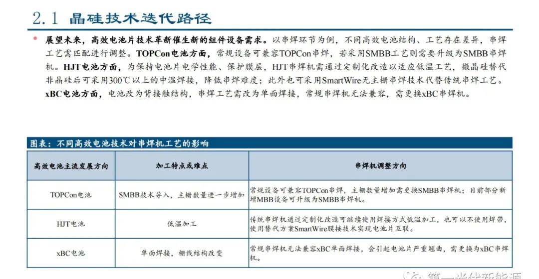 展望未来,高效电池片技术革新催生新的组件设备需求。以串焊环节为例,不同高效电池结构、工艺存在差异,串焊 工艺需匹配进行调整。TOPCon电池方面,常规设备可兼容TOPCon串焊,若采用SMBB工艺则需要升级为SMBB串焊 机。HJT电池方面,为保持电池片电学性能、保护膜层,HJT串焊机需通过定制化改造以适应低温工艺,微晶硅替代 非晶硅后可采用300℃以上的中温焊接,降低串焊难度;此外也可采用SmartWire无主栅串焊技术代替传统串焊工艺。xBC电池方面,电池改为背接触结构,串焊工艺需改为单面焊接,常规串焊机无法兼容,需更换xBC串焊机。