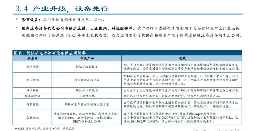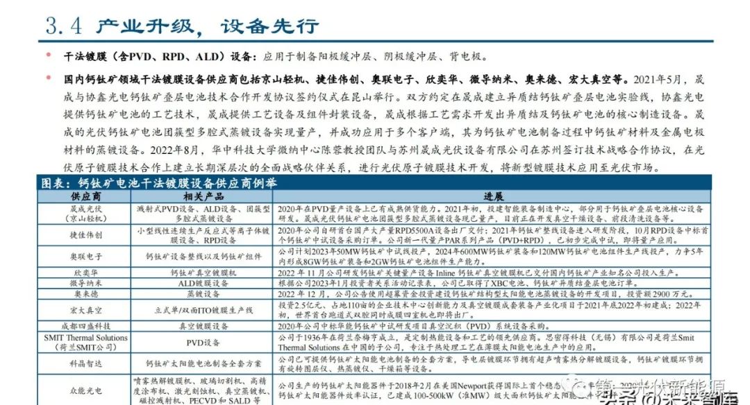 干法镀膜(含PVD、RPD、ALD)设备:应用于制备阳极缓冲层、阴极缓冲层、背电极。国内钙钛矿领域干法镀膜设备供应商包括京山轻机、捷佳伟创、奥联电子、欣奕华、微导纳米、奥来德、宏大真空等。2021年5月,晟 成与协鑫光电钙钛矿叠层电池技术合作开发协议签约仪式在昆山举行。双方约定在晟成建立异质结钙钛矿叠层电池实验线,协鑫光电 提供钙钛矿电池的工艺技术,晟成提供工艺设备及组件封装设备,晟成根据工艺需求开发出异质结及钙钛矿电池的核心制造设备。晟 成的光伏钙钛矿电池团簇型多腔式蒸镀设备实现量产,并成功应用于多个客户端,其为钙钛矿电池制备过程中钙钛矿材料及金属电极 材料的蒸镀设备。2022年8月,华中科技大学微纳中心陈蓉教授团队与苏州晟成光伏设备有限公司在苏州签订技术战略合作协议,在光 伏原子镀膜技术合作上建立长期深层次的全面战略伙伴关系,进行光伏原子镀膜技术开发,将新型镀膜技术应用至光伏市场。