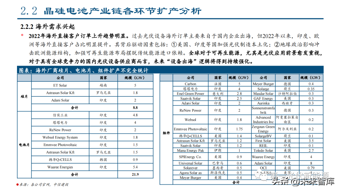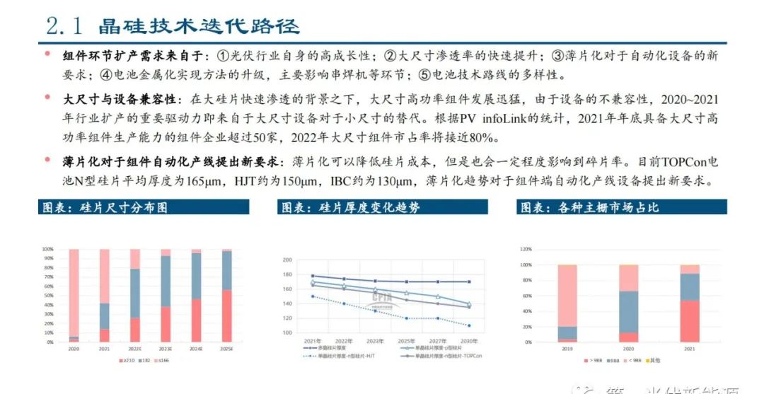 组件环节扩产需求来自于:①光伏行业自身的高成长性;②大尺寸渗透率的快速提升;③薄片化对于自动化设备的新 要求;④电池金属化实现方法的升级,主要影响串焊机等环节;⑤电池技术路线的多样性。大尺寸与设备兼容性:在大硅片快速渗透的背景之下,大尺寸高功率组件发展迅猛,由于设备的不兼容性,2020~2021 年行业扩产的重要驱动力即来自于大尺寸设备对于小尺寸的替代。根据PV infoLink的统计,2021年年底具备大尺寸高 功率组件生产能力的组件企业超过50家,2022年大尺寸组件市占率将接近80%。薄片化对于组件自动化产线提出新要求:薄片化可以降低硅片成本,但是也会一定程度影响到碎片率。目前TOPCon电 池N型硅片平均厚度为165μm,HJT约为150μm,IBC约为130μm,薄片化趋势对于组件端自动化产线设备提出新要求。