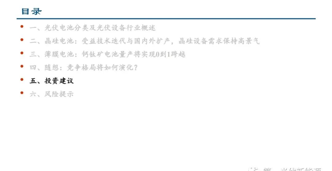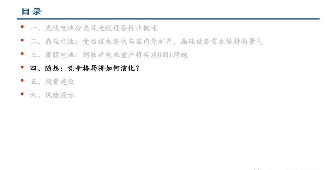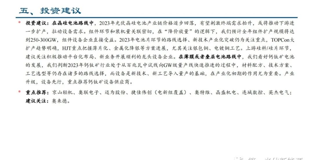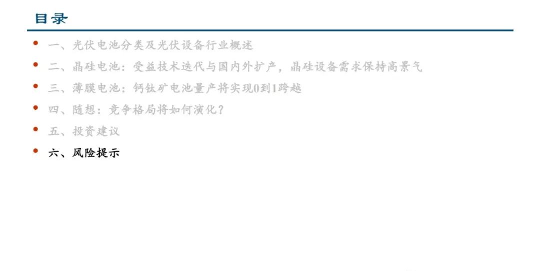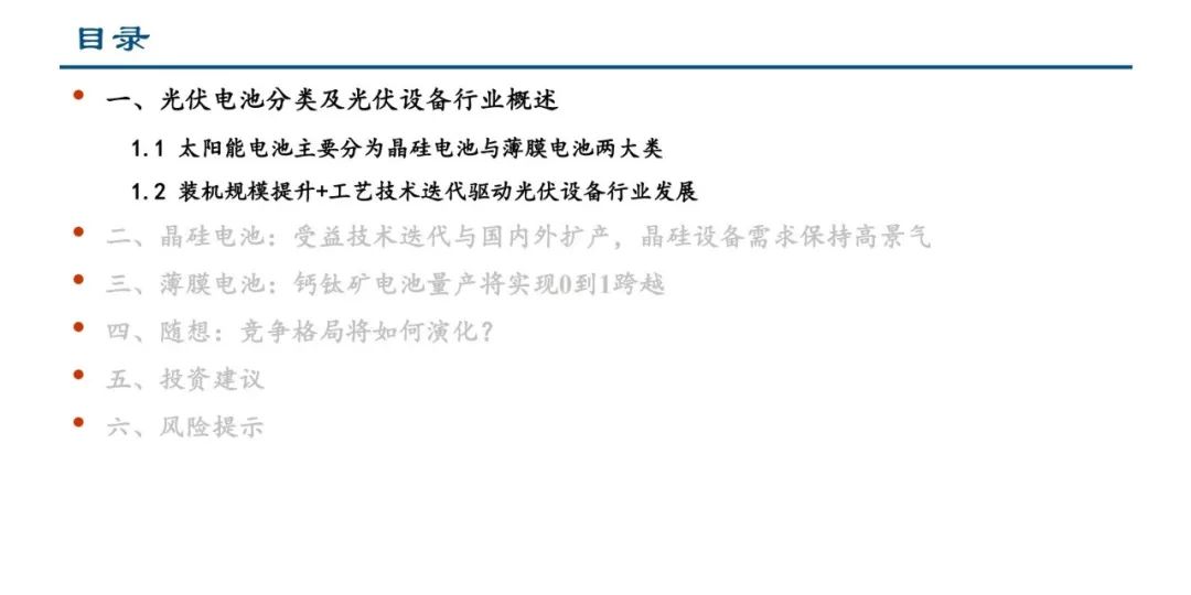 太阳能电池主要分为晶硅电池与薄膜电池两大类,目前晶硅电池占比约95%,薄膜电池正在蓬勃发展。从设备角度来 看,下游扩产是需求的直接动力,终端装机量提升有望带来增量设备需求;同时,光伏行业持续进行技术创新与工艺 迭代,不仅有利于刺激新的扩产需求,还有望加速原有设备的更新替换。晶硅电池方面,受益于技术迭代以及海内外 扩产,整体设备需求保持高景气;薄膜电池方面,我们看好钙钛矿电池的发展,判断2023年钙钛矿行业处于从百兆瓦 中试线向GW级量产线快速推进的过程中,设备是新工艺导入量产的基础,在产业化初期的重要性凸显。展望未来, 当薄膜或叠层时代到来之时,挑战与机遇并存,我们对未来“竞争格局将如何演化?”进行了思考。