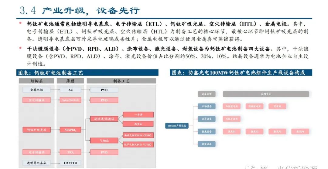 钙钛矿电池通常包括透明导电基底、电子传输层(ETL)、钙钛矿吸光层、空穴传输层(HTL)、金属电极。其中, 电子传输层(ETL)、钙钛矿吸光层、空穴传输层(HTL)为制备工艺的核心环节,最核心环节即钙钛矿吸光层的制 备。透明导电基底层可外采导电玻璃或柔性片;金属电极可以通过使用金属真空蒸镀获得。干法镀膜设备(含PVD、RPD、ALD)、涂布设备、激光设备、封装设备为钙钛矿电池制备四大设备。其中,干法镀 膜设备(含PVD、RPD、ALD)、涂布、激光设备价值占比分别约50%、20%、10%。结晶设备通常为电池企业自主设 计制造。