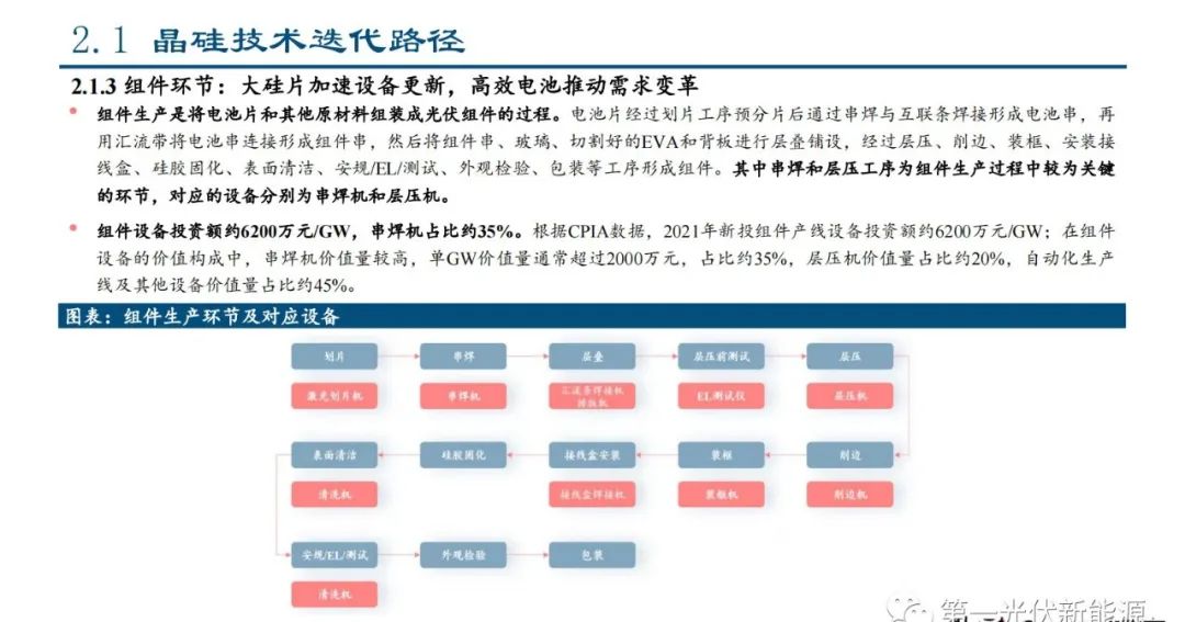 组件生产是将电池片和其他原材料组装成光伏组件的过程。电池片经过划片工序预分片后通过串焊与互联条焊接形成电池串,再 用汇流带将电池串连接形成组件串,然后将组件串、玻璃、切割好的EVA和背板进行层叠铺设,经过层压、削边、装框、安装接 线盒、硅胶固化、表面清洁、安规/EL/测试、外观检验、包装等工序形成组件。其中串焊和层压工序为组件生产过程中较为关键 的环节,对应的设备分别为串焊机和层压机。组件设备投资额约6200万元/GW,串焊机占比约35%。根据CPIA数据,2021年新投组件产线设备投资额约6200万元/GW;在组件 设备的价值构成中,串焊机价值量较高,单GW价值量通常超过2000万元,占比约35%,层压机价值量占比约20%,自动化生产 线及其他设备价值量占比约45%。