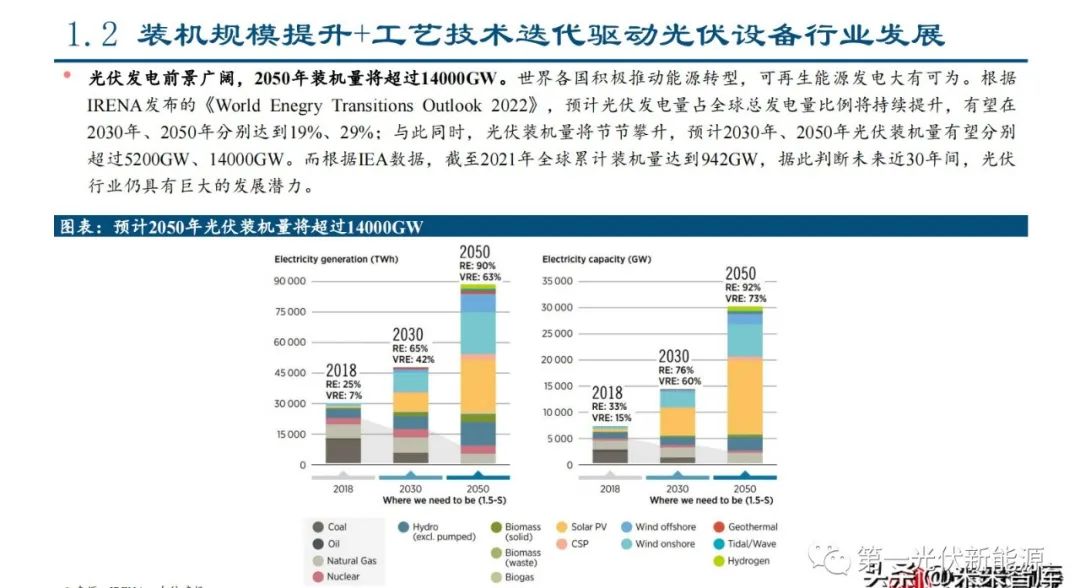 光伏发电前景广阔,2050年装机量将超过14000GW。世界各国积极推动能源转型,可再生能源发电大有可为。根据 IRENA发布的《World Enegry Transitions Outlook 2022》,预计光伏发电量占全球总发电量比例将持续提升,有望在 2030年、2050年分别达到19%、29%;与此同时,光伏装机量将节节攀升,预计2030年、2050年光伏装机量有望分别 超过5200GW、14000GW。而根据IEA数据,截至2021年全球累计装机量达到942GW,据此判断未来近30年间,光伏 行业仍具有巨大的发展潜力。