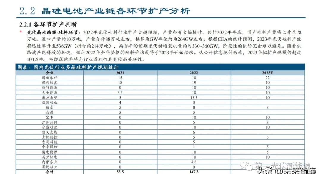 光伏晶硅路线-硅料环节:2022年光伏硅料行业扩产大超预期,产量亦有大幅提升。预计2022年年底,国产硅料产量将上升至78 万吨、进口产量约10万吨,产量合计88万吨左右,换算为GW单位约为264GW左右。根据CEA的统计预测,2023年光伏硅料产能 将迅速攀升至536GW(折合约214万吨),而当年的预期光伏新增装机量约为330~360GW,阶段性的供给冗余难以避免。随着供 给端产能释放的加速,预计2022年全年坚挺的硅料价格或将于2023年开始松动。从公开信息统计来看,2023年拟扩产规模仍超过 100万吨,实际落地率将与行业盈利性具有较高关联性。