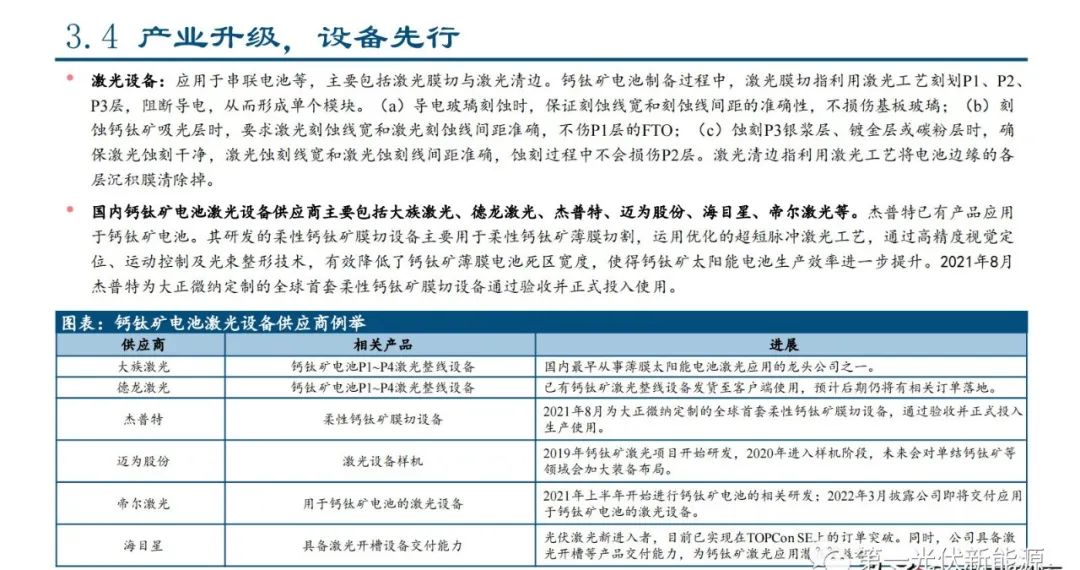 国内钙钛矿电池激光设备供应商主要包括大族激光、德龙激光、杰普特、迈为股份、海目星、帝尔激光等。杰普特已有产品应用 于钙钛矿电池。其研发的柔性钙钛矿膜切设备主要用于柔性钙钛矿薄膜切割,运用优化的超短脉冲激光工艺,通过高精度视觉定 位、运动控制及光束整形技术,有效降低了钙钛矿薄膜电池死区宽度,使得钙钛矿太阳能电池生产效率进一步提升。2021年8月 杰普特为大正微纳定制的全球首套柔性钙钛矿膜切设备通过验收并正式投入使用。