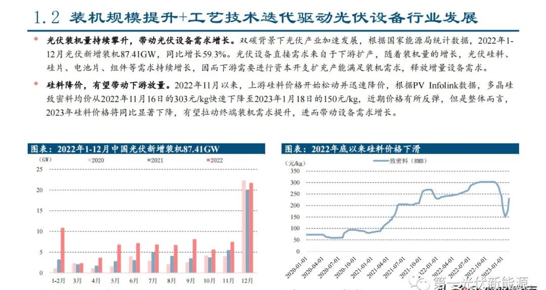 光伏装机量持续攀升,带动光伏设备需求增长。双碳背景下光伏产业加速发展,根据国家能源局统计数据,2022年1- 12月光伏新增装机87.41GW,同比增长59.3%。光伏设备直接需求来自于下游扩产,随着装机量的增长,光伏硅料、 硅片、电池片、组件等需求持续增长,因而下游需要进行资本开支扩充产能满足装机需求,释放增量设备需求。硅料降价,有望带动下游放量。2022年11月以来,上游硅料价格开始松动并迅速降价,根据PV Infolink数据,多晶硅 致密料均价从2022年11月16日的303元/kg快速下降至2023年1月18日的150元/kg,近期价格有所反弹,但是整体而言, 2023年硅料价格将同比显著下降,有望拉动终端装机需求提升,进而带动设备需求增长。