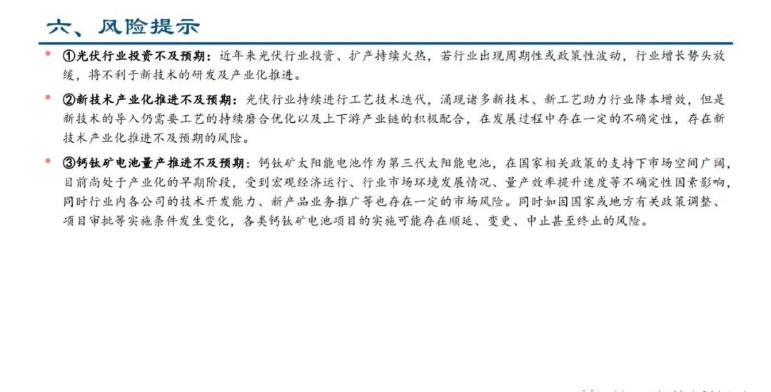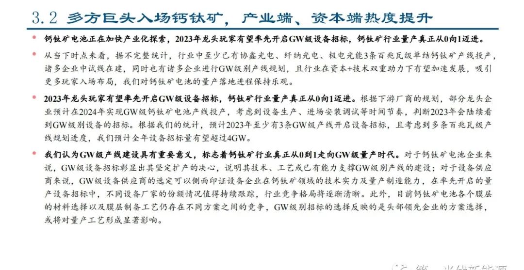 我们认为GW级产线建设具有重要意义,标志着钙钛矿行业真正从0到1走向GW级量产时代。对于钙钛矿电池企业来 说,GW级设备招标彰显出其坚定扩产的决心,说明其技术、工艺或已有能力支撑GW级别产线的建设;对于设备供应 商来说,GW级设备供应商的选定可以侧面印证设备企业在钙钛矿领域的技术实力及量产制造能力,在率先开启的量 产设备招标中,不同设备厂家的份额情况值得持续跟踪,行业竞争格局将逐渐清晰。此外,目前钙钛矿电池各个膜层 的材料选择以及膜层制备工艺仍存在不同方案之间的竞争,GW级别招标的选择反映的是头部领先企业的方案选择, 或将对量产工艺形成显著影响