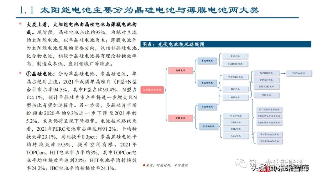 ①晶硅电池:分为单晶硅电池、多晶硅电池,单 晶占绝对主流。2021年我国单晶硅片(P型+N型) 合计市占率94.5%,其中P型占比90.4%,N型占 比4.1%,预计单晶硅片市占率将进一步增大且N 型占比有望加速提升。另一方面,多晶硅片市场 份额由2020年的9.3%进一步下降至2021年的 5.2%,未来仍将呈现下降趋势。电池技术路线来 看,2021年PERC电池市占率达到91.2%,平均转 换效率23.1%,同比提升0.3pct;多晶黑硅电池平 均转换效率19.5%, 提升空间有限 。2021 年 TOPCon、HJT电池市占率约3%,其中TOPCon电 池平均转换效率达到24%;HJT电池平均转换效 率24.2%;IBC电池平均转换效率24.1%。