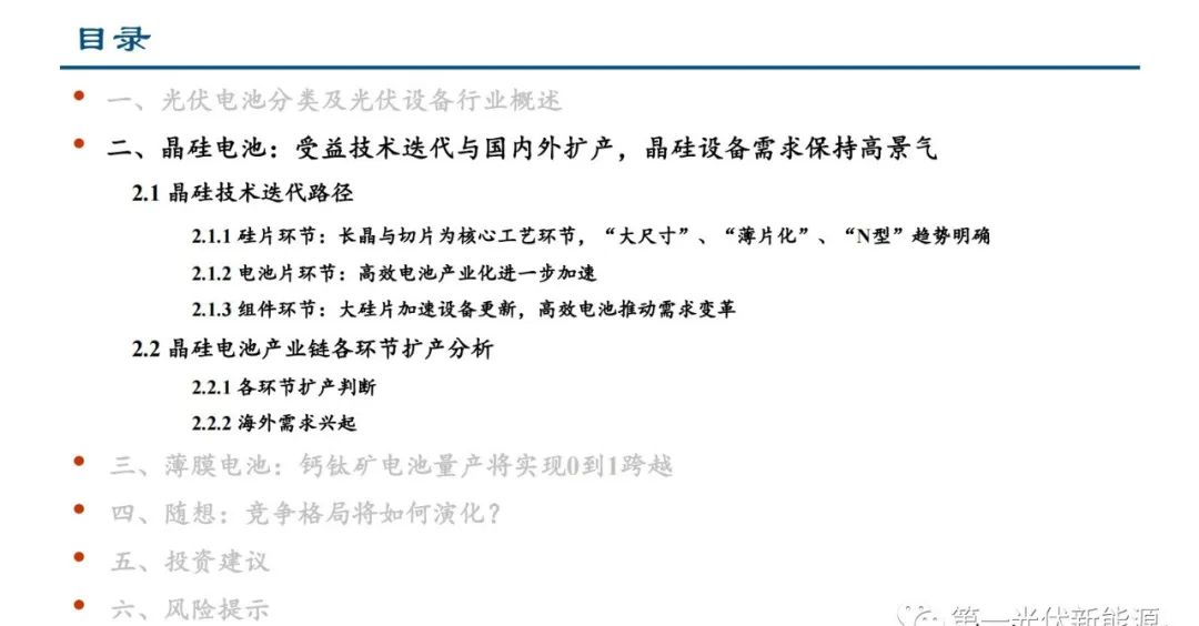 技术迭代不停,设备投资机会不歇。降本增效是光伏行业向前发展的主题,如何实现单瓦发电成本的最优化是光伏企 业持续为之奋斗的方向。我们以晶硅光伏电池产业链为例进行说明,其降低光伏成本的方式主要包括:1)硅片做大摊 薄成本;2)硅片切薄摊薄成本;3)电池片的转换效率提升提高发电量从而摊薄成本;4)新的组件技术发展提升发电 量、降低耗材使用量摊薄成本;5)各环节设备、材料的国产化降低成本等。而目前最重要的技术变化则是高效电池扩 产带来的产业链技术革新,涉及硅片、电池片、组件等各个环节。技术革新不仅有利于刺激新的扩产需求,还有望加 速实现原有产能中设备的更新替换,带来相应的光伏设备需求。
