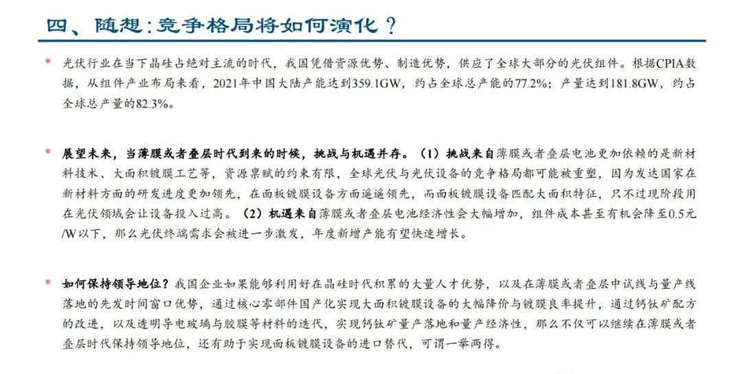 光伏行业在当下晶硅占绝对主流的时代,我国凭借资源优势、制造优势,供应了全球大部分的光伏组件。根据CPIA数 据,从组件产业布局来看,2021年中国大陆产能达到359.1GW,约占全球总产能的77.2%;产量达到181.8GW,约占 全球总产量的82.3%。展望未来,当薄膜或者叠层时代到来的时候,挑战与机遇并存。(1)挑战来自薄膜或者叠层电池更加依赖的是新材 料技术、大面积镀膜工艺等,资源禀赋的约束有限,全球光伏与光伏设备的竞争格局都可能被重塑,因为发达国家在 新材料方面的研发进度更加领先,在面板镀膜设备方面遥遥领先,而面板镀膜设备匹配大面积特征,只不过现阶段用 在光伏领域会让设备投入过高。(2)机遇来自薄膜或者叠层电池经济性会大幅增加,组件成本甚至有机会降至0.5元 /W以下,那么光伏终端需求会被进一步激发,年度新增产能有望快速增长。