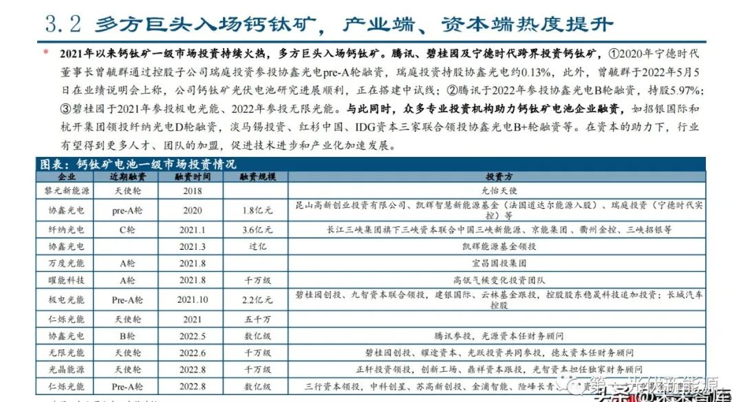 2021年以来钙钛矿一级市场投资持续火热,多方巨头入场钙钛矿。腾讯、碧桂园及宁德时代跨界投资钙钛矿,①2020年宁德时代 董事长曾毓群通过控股子公司瑞庭投资参投协鑫光电pre-A轮融资,瑞庭投资持股协鑫光电约0.13%,此外,曾毓群于2022年5月5 日在业绩说明会上称,公司钙钛矿光伏电池研究进展顺利,正在搭建中试线;②腾讯于2022年参投协鑫光电B轮融资,持股5.97%;③碧桂园于2021年参投极电光能、2022年参投无限光能。与此同时,众多专业投资机构助力钙钛矿电池企业融资,如招银国际和 杭开集团领投纤纳光电D轮融资,淡马锡投资、红杉中国、IDG资本三家联合领投协鑫光电B+轮融资等。在资本的助力下,行业有望得到更多人才、团队的加盟,促进技术进步和产业化加速发展。