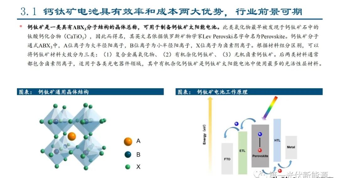 钙钛矿是一类具有ABX3分子结构的晶体总称,可用于制备钙钛矿太阳能电池。此类氧化物最早被发现于钙钛矿石中的 钛酸钙化合物(CaTiO3),因此而得名,其英文名依据俄罗斯矿物学家Lev Perovski名字命名为Perovskite。钙钛矿分子 通式ABX3中,A位离子为大半径阳离子,B位离子为小半径阳离子,X位离子为卤素阴离子。根据材料组分区别,可以 将钙钛矿材料大致分为三类:(1)复合金属氧化物、(2)有机杂化钙钛矿、(3)无机卤素钙钛矿。后两类材料通常 都包含卤素阴离子,适用于各类光电器件领域,其中有机杂化钙钛矿是钙钛矿太阳能电池中使用最多的光活性层材料。